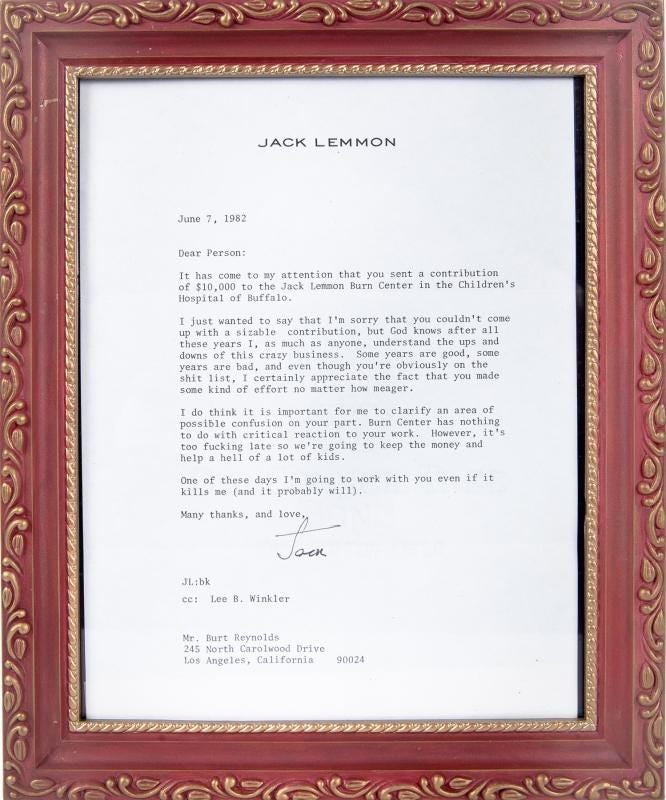 JACK LEMMON being hilarious. Man, Jack Lemmon was cool. Here he lovingly gives Burt Reynolds shit in a typed letter about a generous donation to his charity hospital: