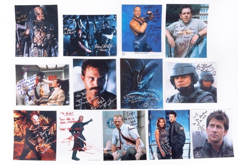 A particularly strange lot contains autographs from Simon Pegg and Nick Frost, pro-wrestler Rob Van Dam, and The fucking Predator.