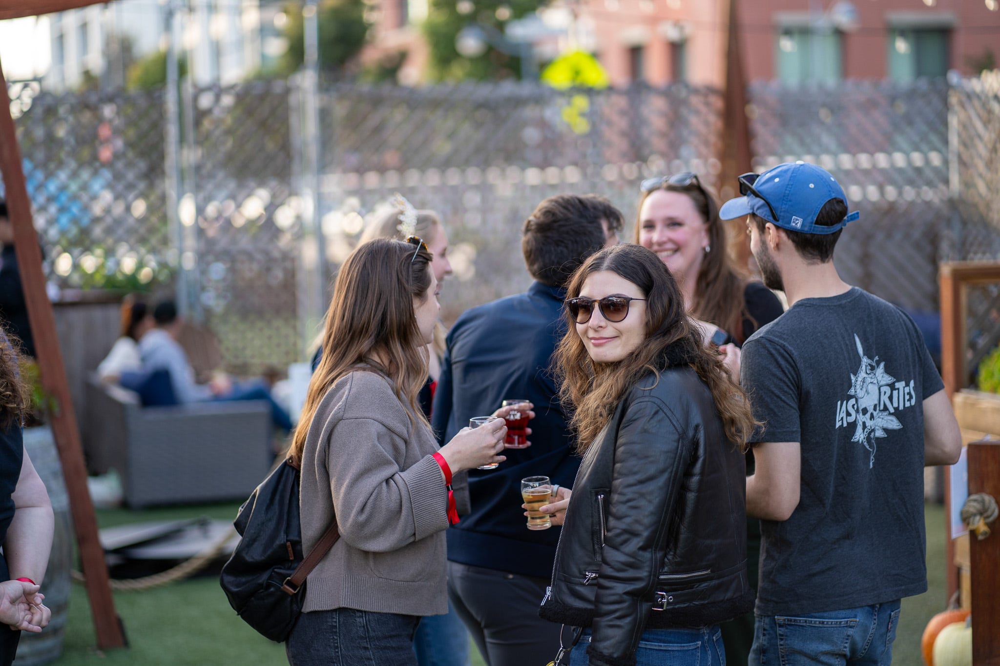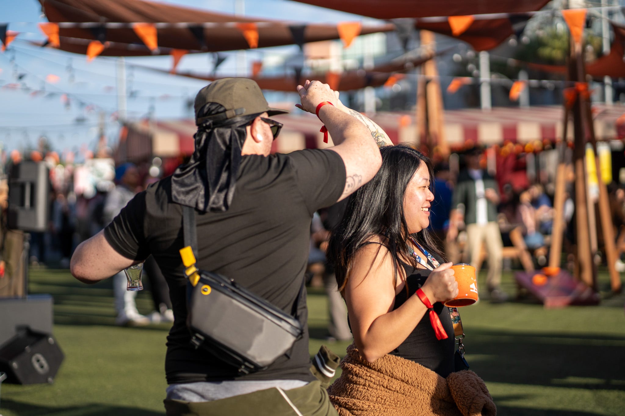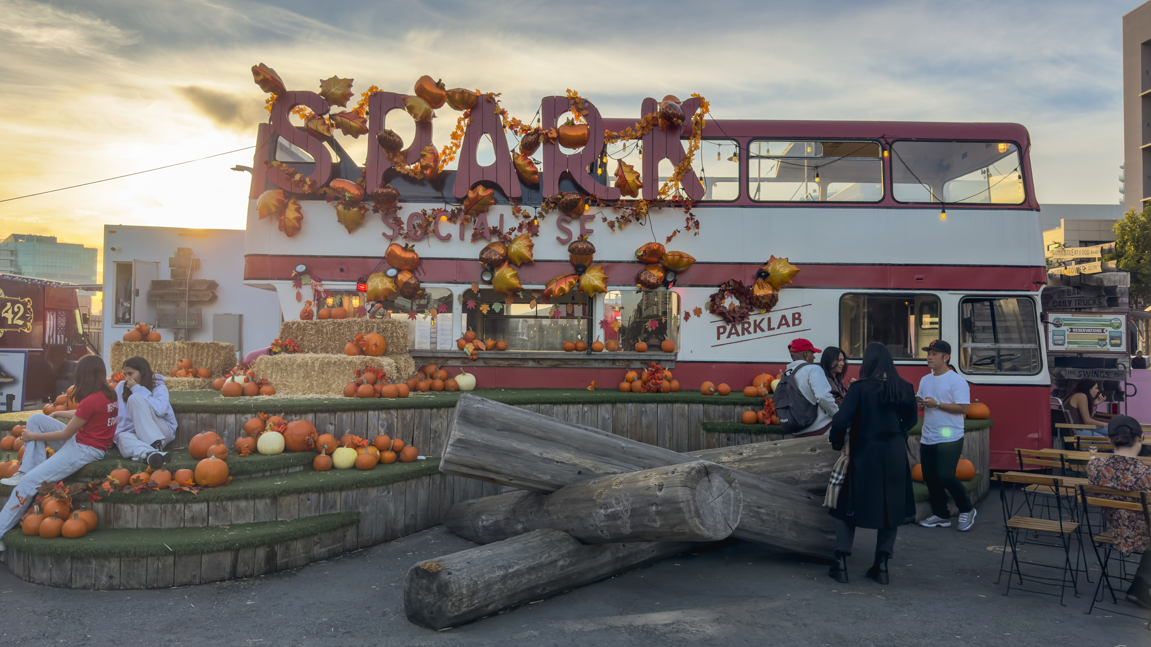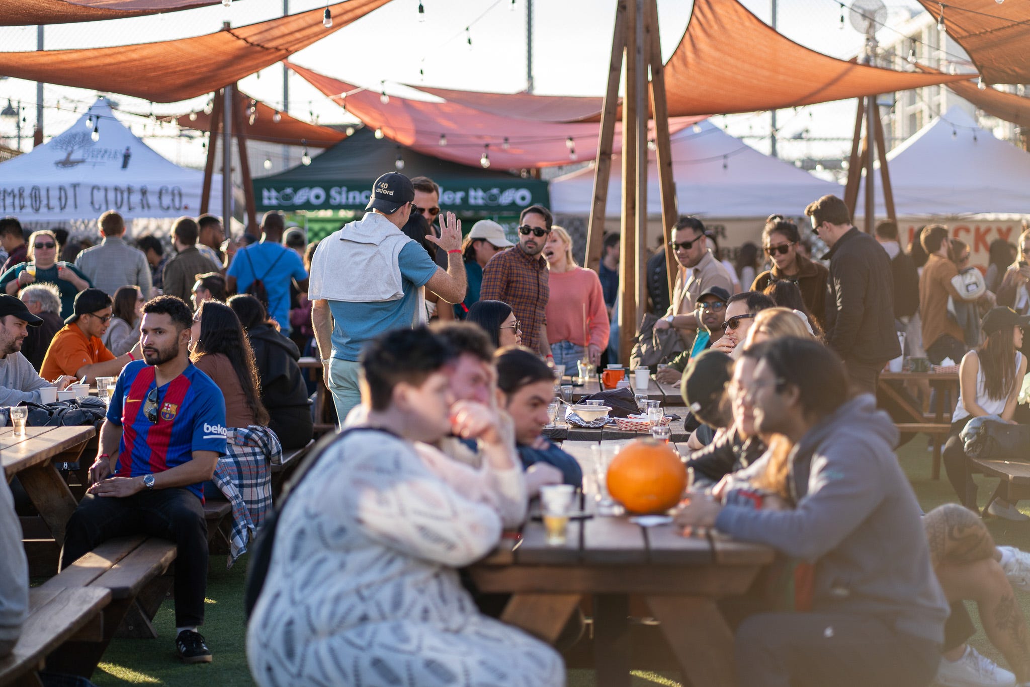 SPARK Social SF is an 18,000-square-foot space that offers a rotating selection of 16 food vendors, fire pits, a sangria bar, and a double-decker bus for events in Mission Bay. For Saturday’s event, organizers decked the bus in fall leaves, pumpkins, and hay stacks, and the cider was flowing like the salmon of Capistrano.
