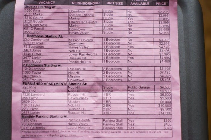 My coworker Max brought in this flier from RentSFNow, where the prices are very telling when it comes to current real estate madness in this city. A studio in Hayes Valley, Duboce Triangle, Downtown, and other listed neighborhoods, runs from $2,295-$2,795. One bedrooms go from $2,695 to close to five grand. And then there’s the $14,000 apartment (furnished, for those who find buying furniture a burden) in Russian Hill.