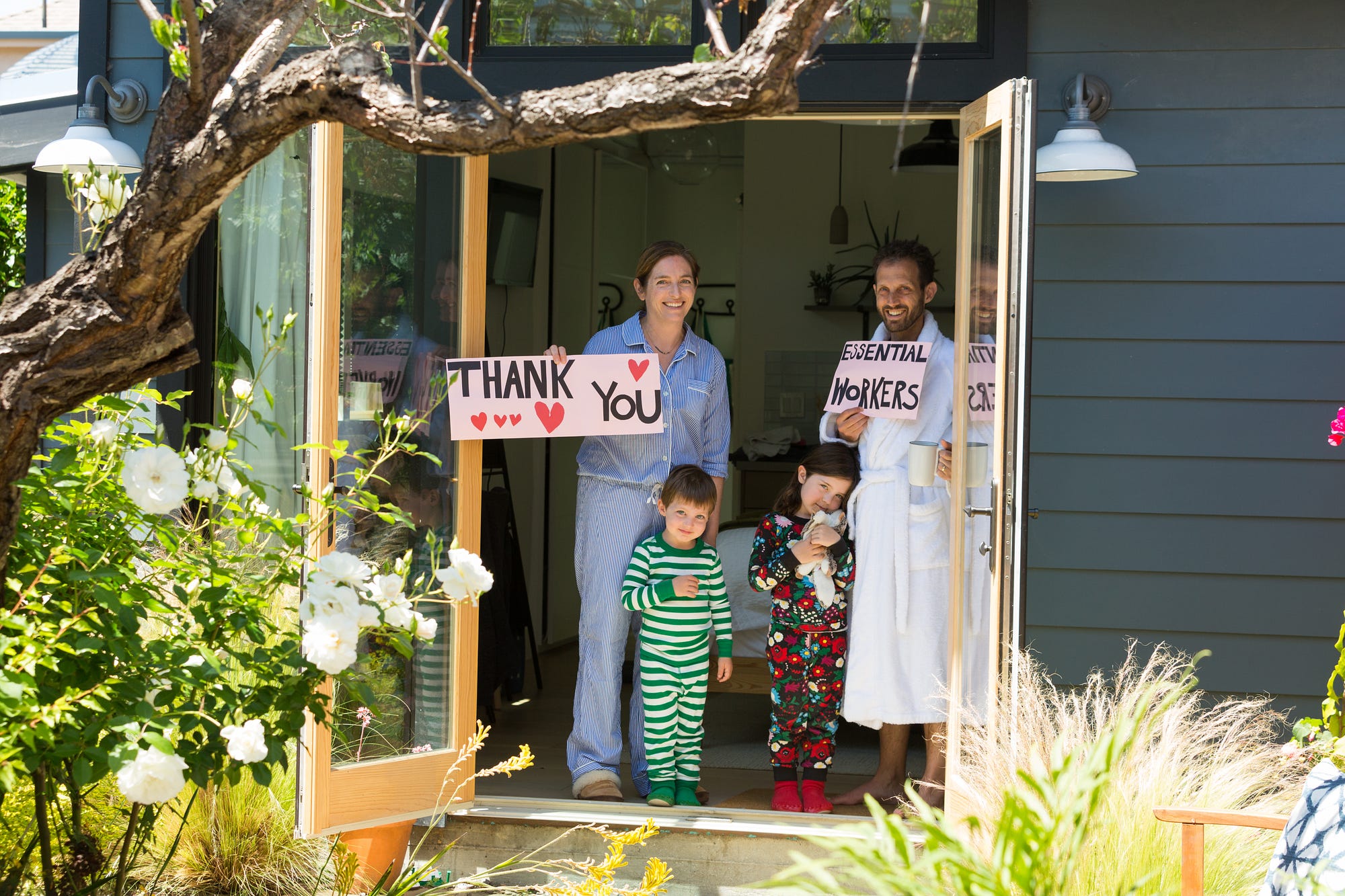 “We haven’t been hosting Airbnb guests, so wanted to show what we’re doing with the space instead (it now houses a trampoline and home office) and we wanted to thank the essential workers taking care of our community.”