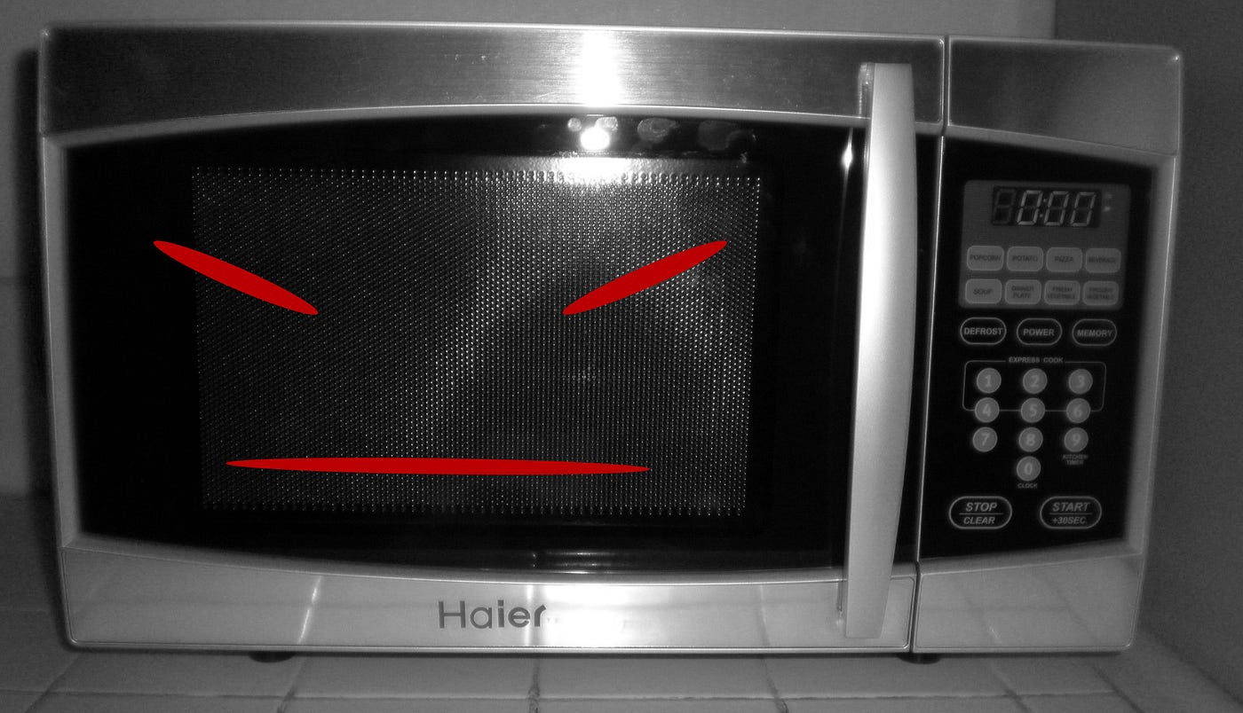 That is not to say that a broken or modified microwave oven could not harm you. If you, say, launched a cocktail shaker at a microwave door while reheating some fondue, thereby smashing the door, and you then decided to put your face right up to the smashed door, you would get burned. Don’t do this.