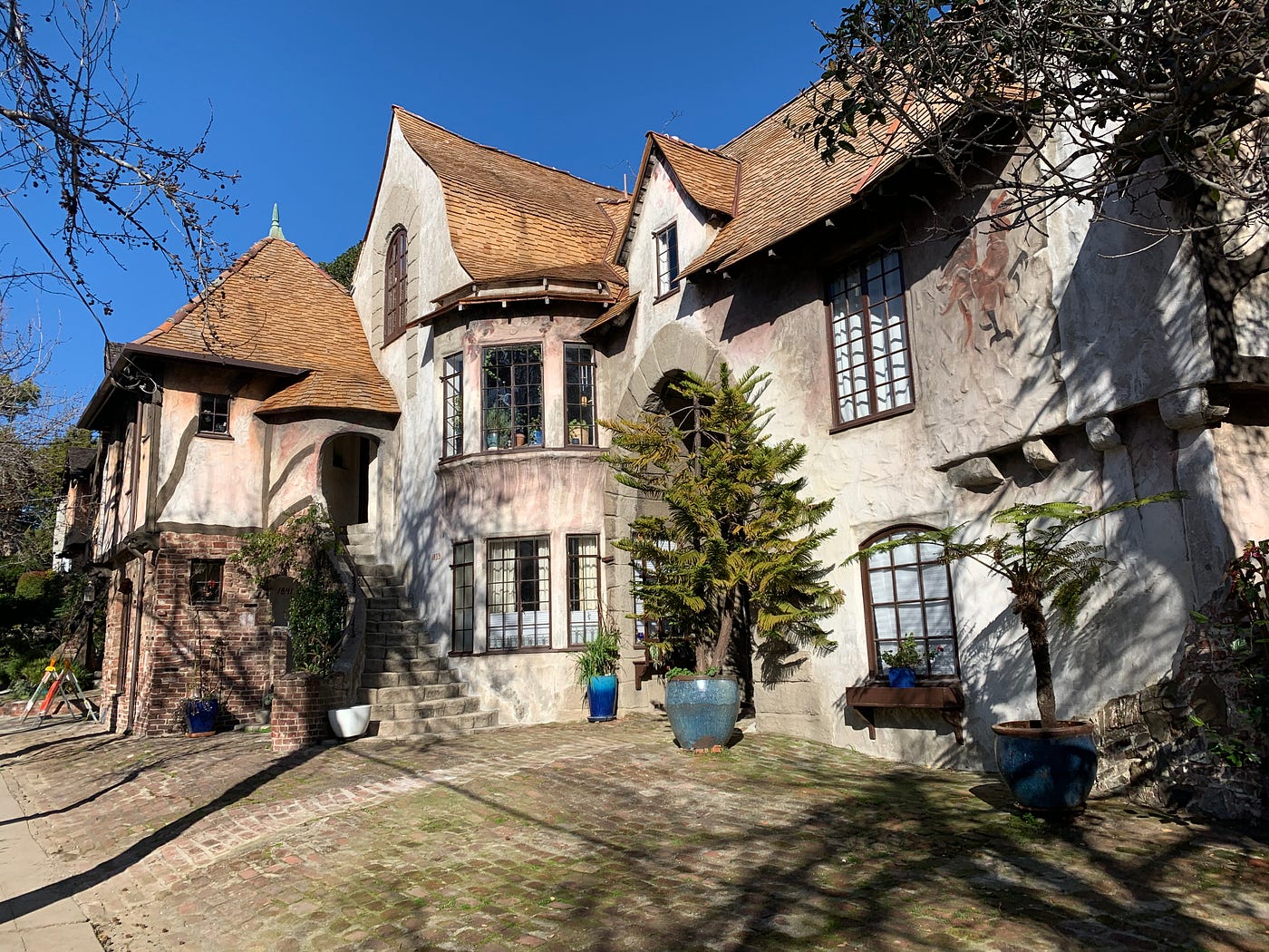 Its intricate carved fences, curving staircases, rounded turrets, and wooden gargoyles make it an altogether baffling site within walking distance of the Cal Campus. It was developed by a 25-year-old Californian named John Thornburg, based on designs by William Raymond Yelland, an Oakland architect and World War I veteran. According to a 1927 article in the Oakland Tribune, Thornburg envisioned it as a self-contained “village,” complete with cafés and shops among the residences. Zoning issues meant that was never to be, but today it’s a Berkeley Historical Landmark and remains a residential apartment building.