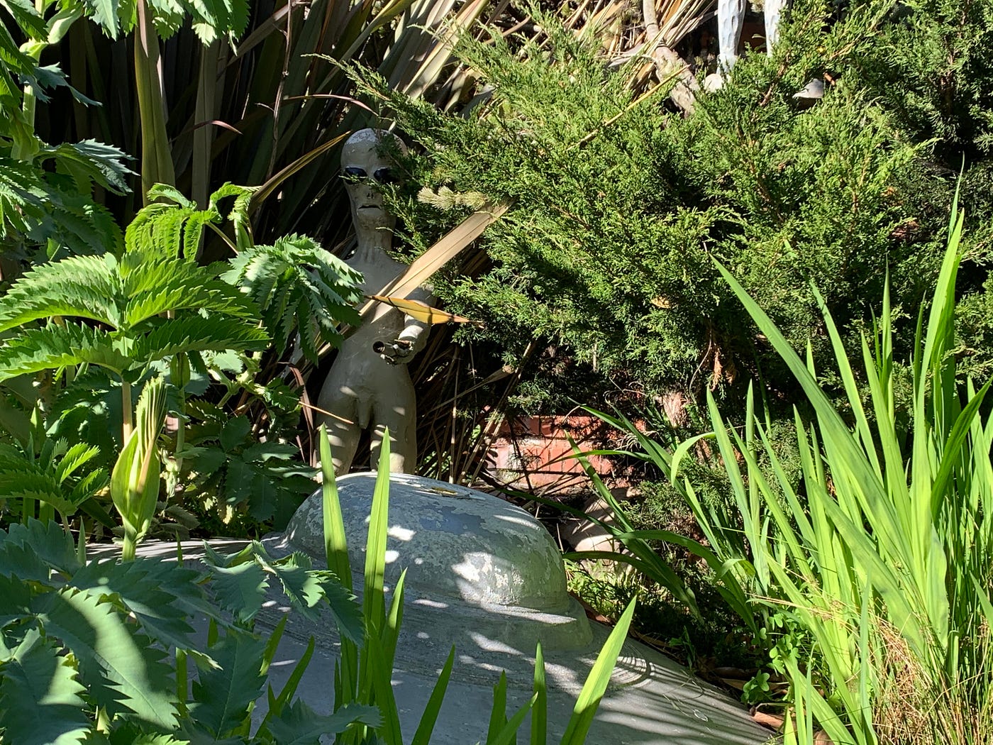 The scene is tucked into the beautiful home’s greenery: a classic saucer-shaped UFO appears to have crashed among the succulents, the bug-eyed (and well-endowed) extraterrestrial pilot standing with arm outstretched over his downed interstellar craft. At night, twinkling lights enhance the old-school sci-fi movie feel. Don’t miss the “Berkeley or Bust” bumper sticker stuck to the alien ship.