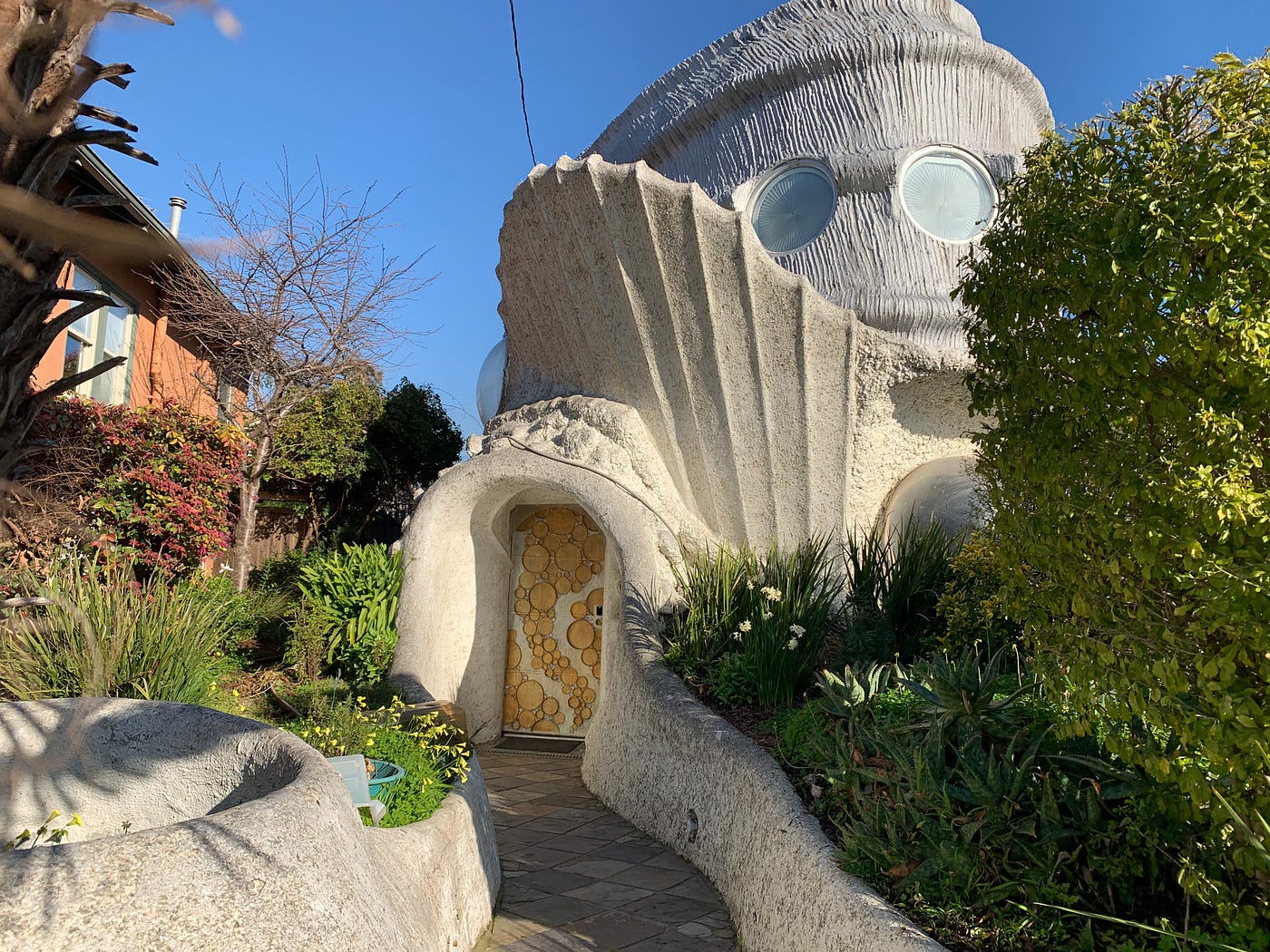 This particular design of Tssui’s is reportedly inspired by the tiny but mighty tardigrade, a nearly microscopic, nearly indestructible animal. Without knowing that specific design origin, one might think the house resembles the home of a mythical sea god if they had their own version of suburbs in the deep. The place quite literally sparkles, thanks to crushed abalone shells pressed into the exterior. Its official name is apparently Ojo del Sol or Tai Yang Yen (the Sun’s Eye) as a nod to the prominent oculus window feature.