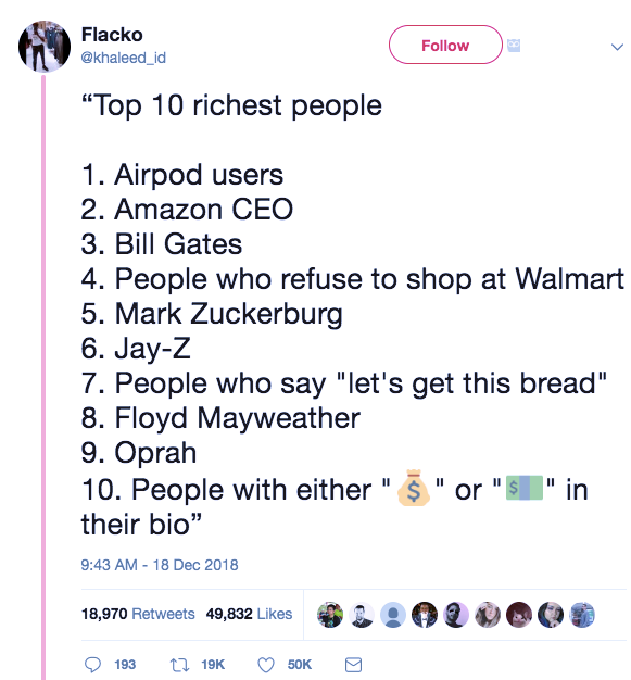 In response to the (obnoxious) 19-year-old couple whose post on social media asked, “Bought our first house at age 19…What Y’all buying?” @vicxkat replied “Airpods.” The tweet was liked 57,060 times.