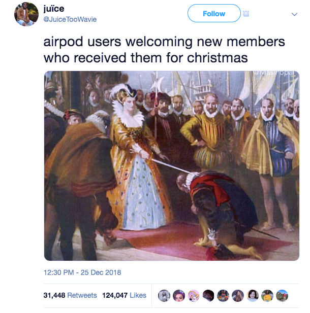 AirPods were released in 2016, but it wasn’t until December 2018 that they started to take on a life of their own. That holiday season, the Twittersphere churned out joke after joke expressing the elitism that one feels when popping in AirPods, from a meme featuring Weimaraners in turtlenecks beneath the caption “I know these dogs have AirPods,” to a viral photo of an AirPods case tucked in between a pillow and a 100-dollar bill.