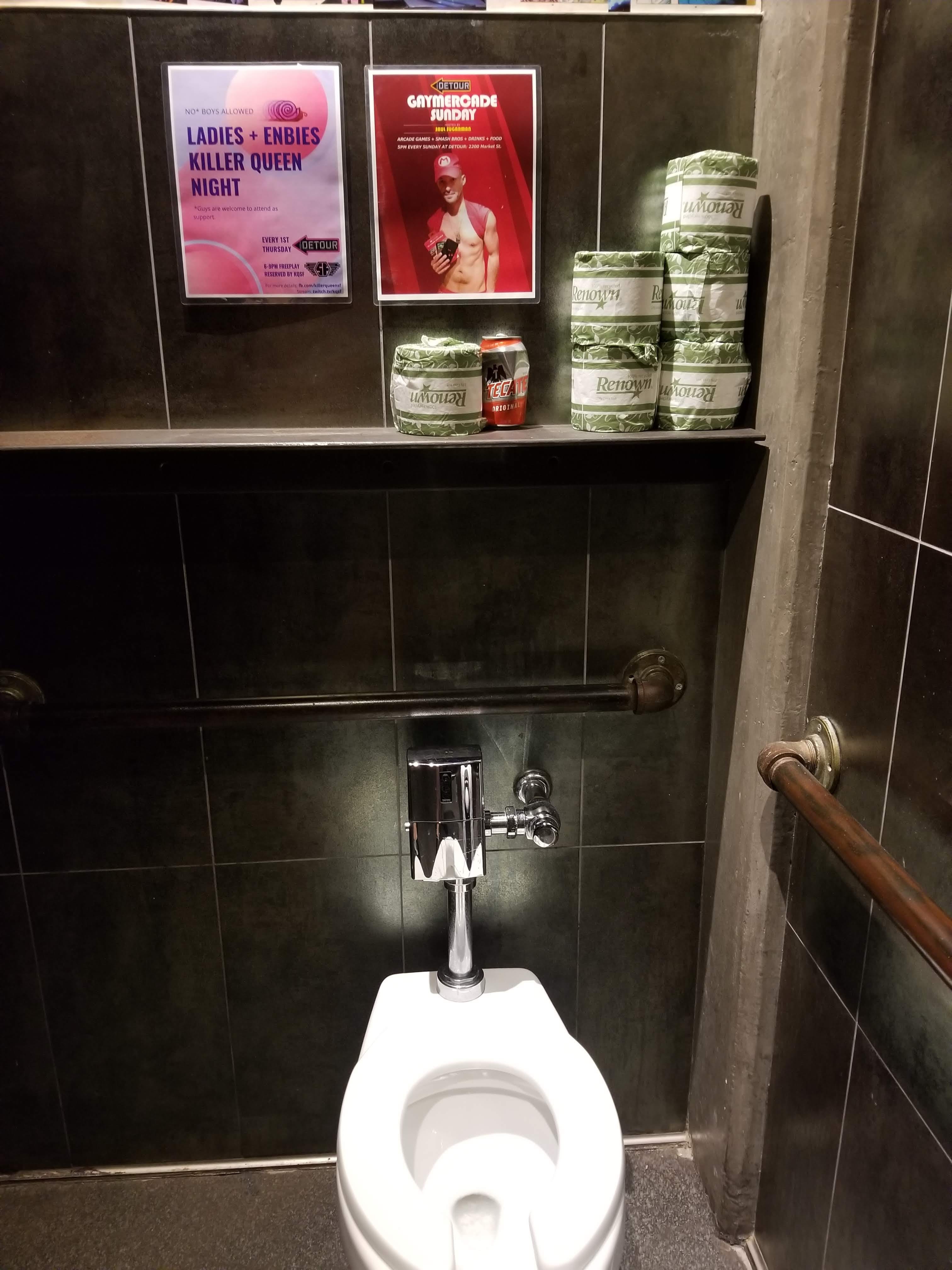 The Detour is a rare gem in this regard. The bathrooms are way off from the main arcade games, dining and cocktails. The walls are super solid with plenty individual toilets, and the music is loud besides. No one will hear what you’re doing, and chances are it won’t get busy enough that someone will come knocking.
