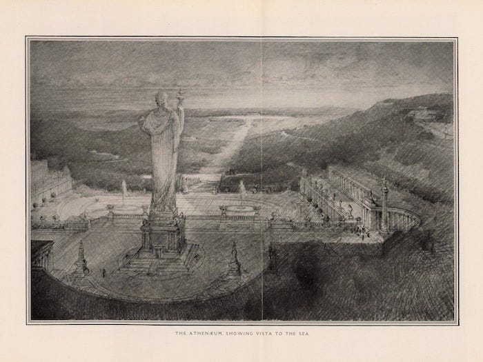 Burnham gladly accepted the challenge of applying his utopian-like style to what was then a San Francisco trying to get rid of its seedy Barbary Coast reputation. He started to lay out his plans from his secluded bungalow on the top of Twin Peaks, which included everything from functional districts like Civic Center connected by wide tree-lined boulevards to a grandiose Athenaeum at Twin Peaks complete with a 300-ft. statue. Here is a selection of some of his plans: