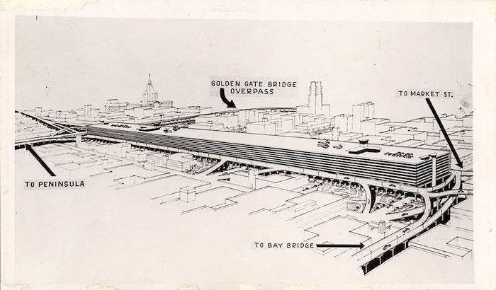Sketch of proposed SOMA parking building spanning five blocks, 1947.