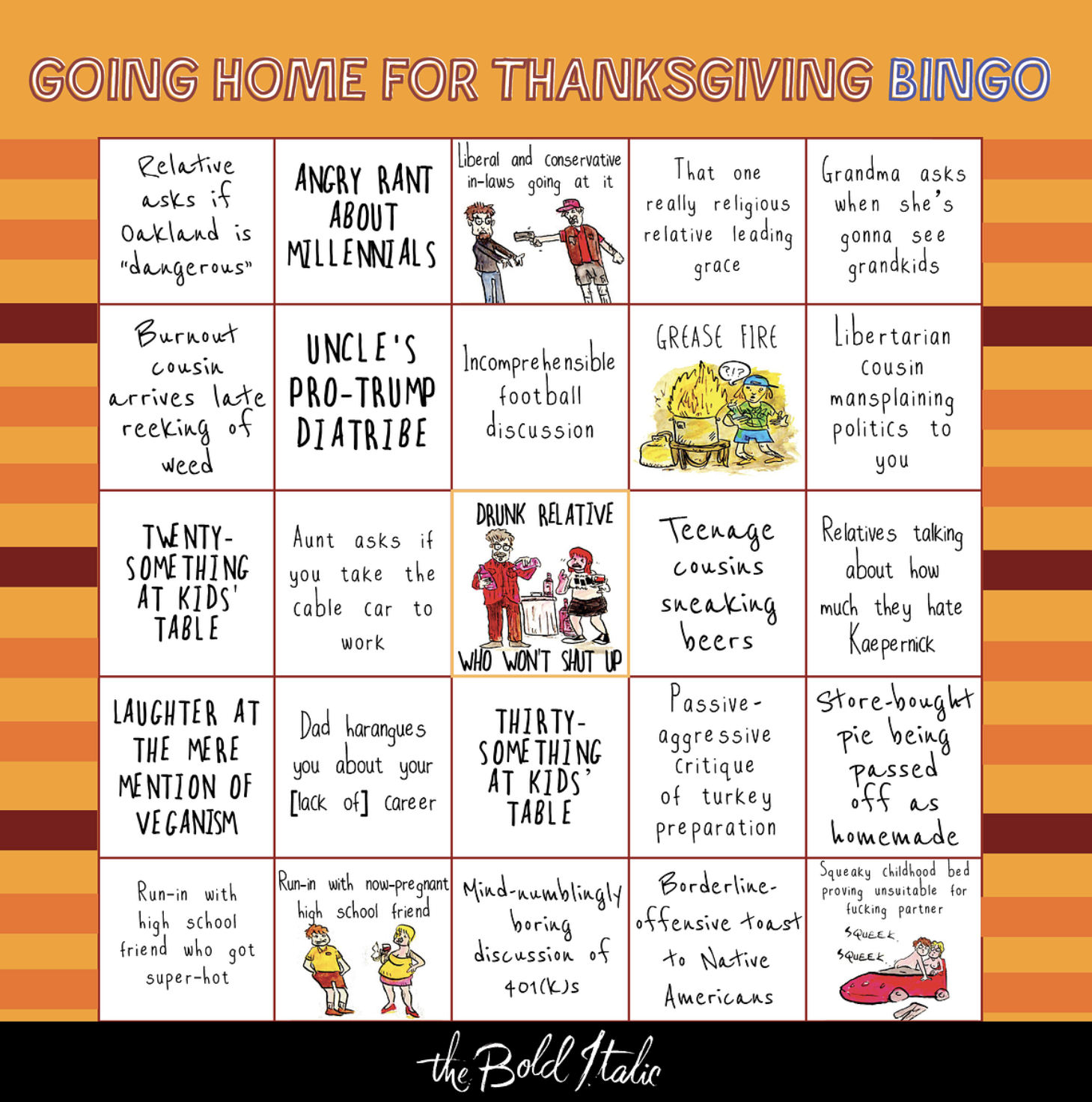 In any case, we put together a bingo card to help make this stressful holiday a little more bearable. Instead of bottling up your rage over your aunt’s racist polemics, share your anger with this bingo card. If you get five in a row, you probably grew up in a red state.