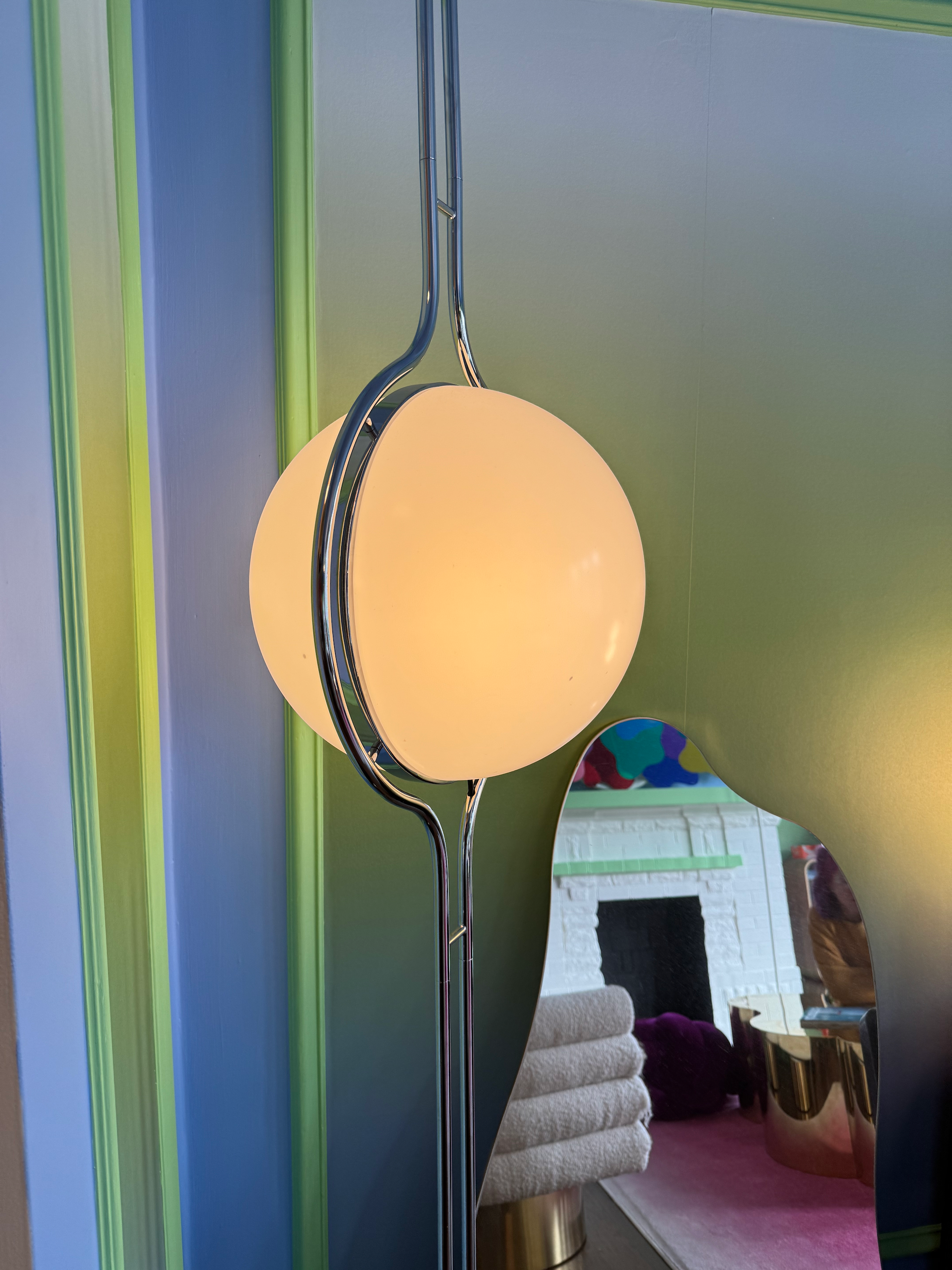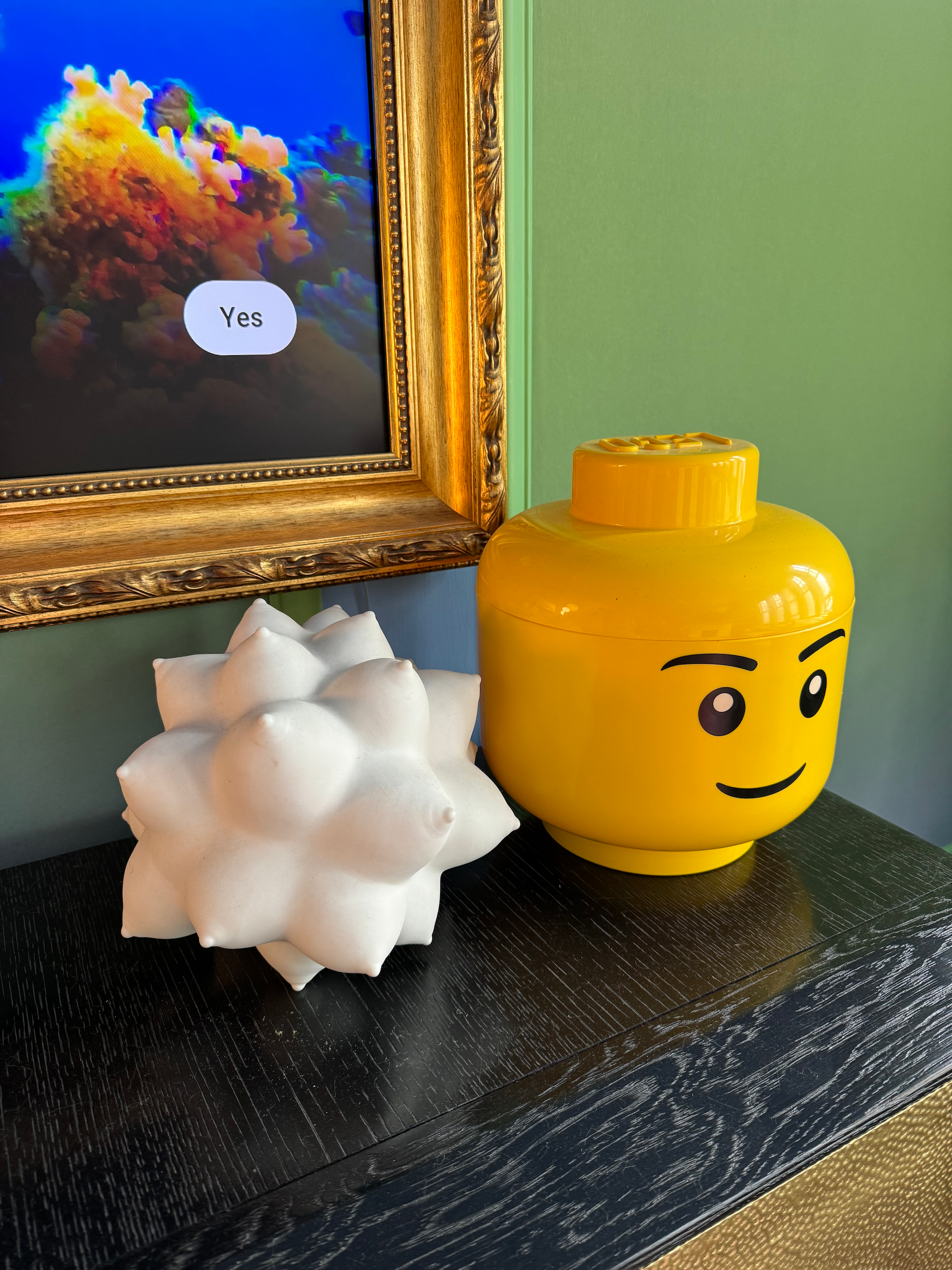 Asked if she misses that house, she says, “I have zero attachment to things. I call myself a minimal maximalist. Clean and loud. My walls are crazy and I have statement pieces, like a boob orb and a big Lego head. But I don’t have knick-knacks.”