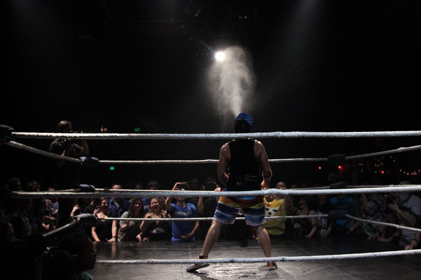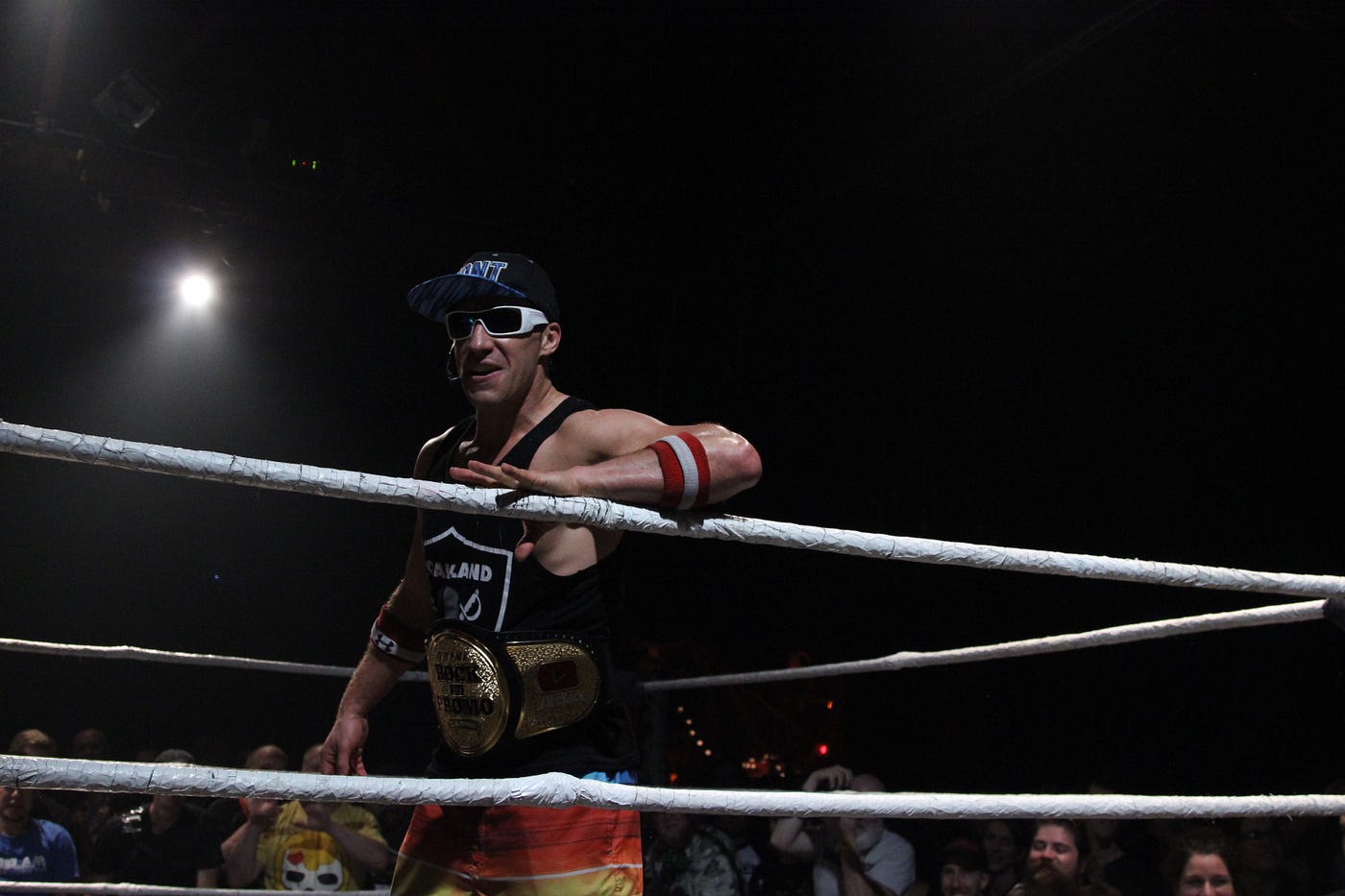 Everyone performing has their own distinct wrestling persona. (Some have several.) When interviewing A.J. Kirsch, the host of Hoodslam, I asked him if he wanted to be interviewed as himself or in character as Broseph Joe Brody, the bro extraordinaire who both wrestles and emcees. He scoffed and said, “Dude, that guy’s a dick.”