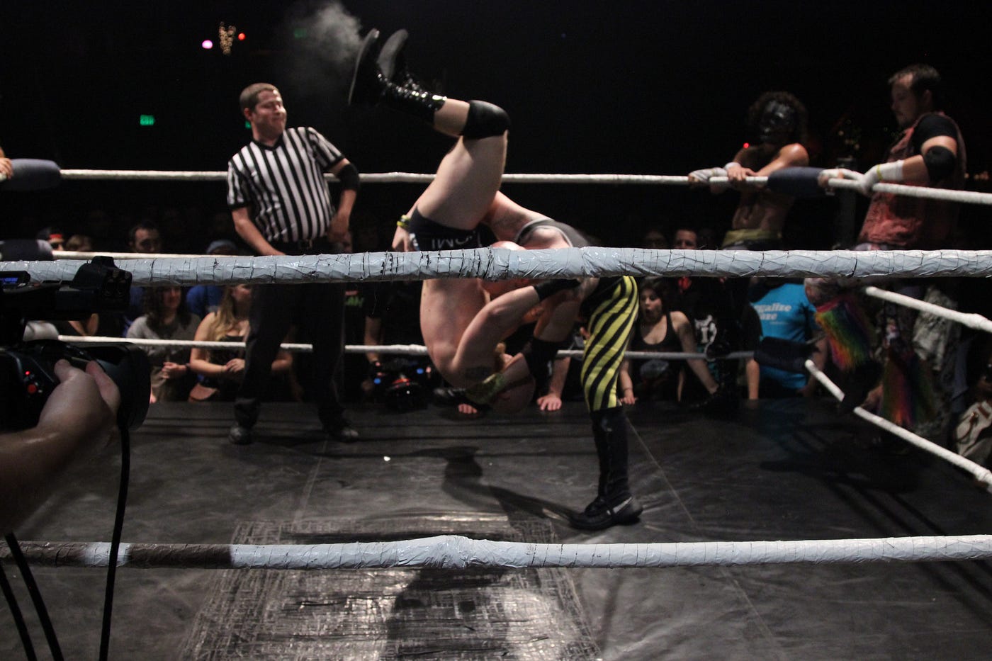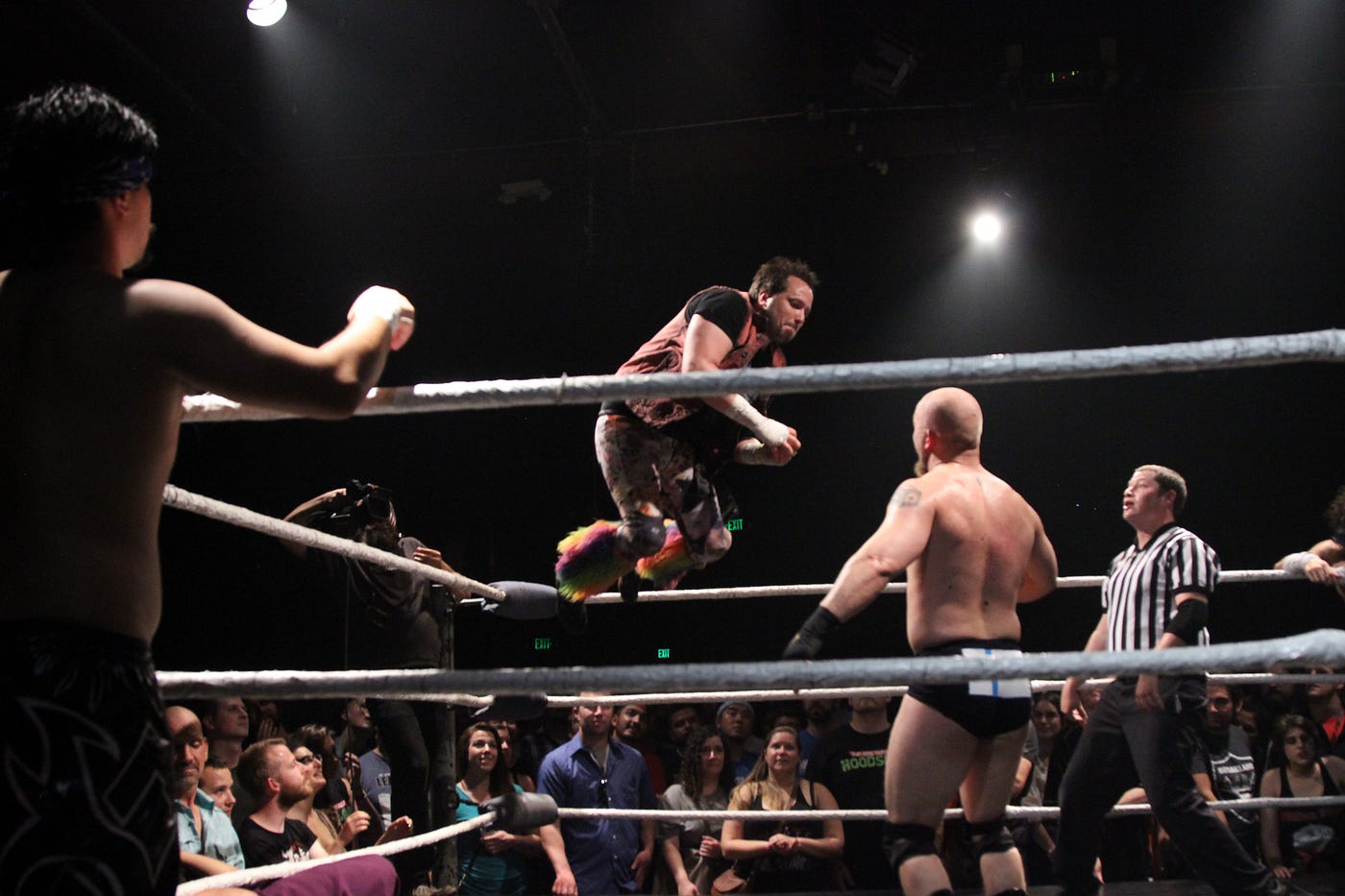 I’ve seen two wrestlers grab the referees and use them as proxy fighters, manipulating their arms and bodies like rag dolls to dodge each other’s blows. I’ve seen an evil mad-scientist-turned-clown (that would be Doc Atrocity) use telekinesis to destroy his opponent from 20 feet away. I’ve seen a flailing Link (as in, the protagonist from Zelda) reach into his treasure chest mid-match, pull out a bottle of vodka, and then chug it to “regain” his strength. (Link, thoroughly inebriated, went on to win the match.)
