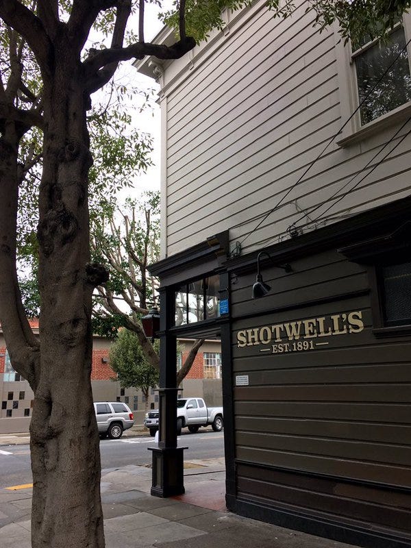 Interestingly, Shotwell’s began life as a “grocery saloon,” meaning a market with a bar in the back. Then came the 1906 earthquake and, later, a fire, which destroyed much of the neighborhood. During the rebuilding, City Hall seized the opportunity to ban grocery saloons in order to keep children out of establishments that serve alcohol. So the owner did what anyone (at least what I) would do: he scrapped the groceries and rebuilt the place as a bar.