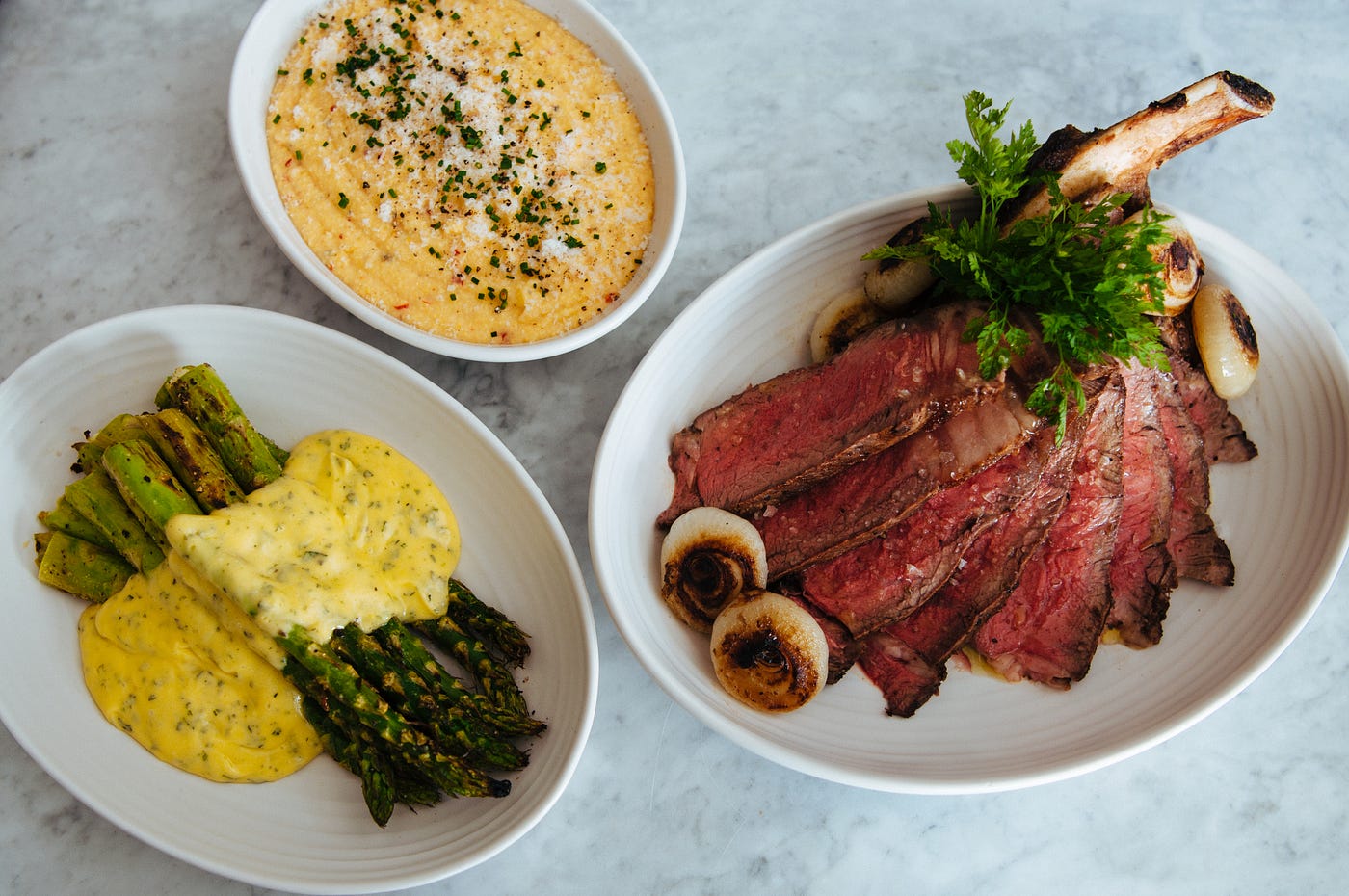 This philosophy has paid off. The throwback-themed restaurant has caught on as a bright and airy casual spot in which families can gather and bond over a meal, with many sharing the Family Supper ($120, serves four people) with beef tomahawk chop, asparagus, chili-cheese polenta, cipollini onion and Béarnaise sauce.