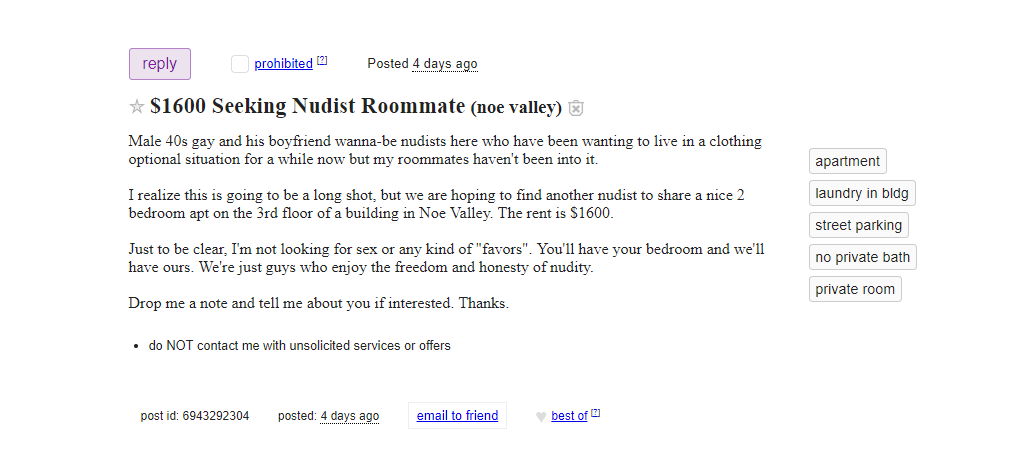 The offer here is to share a two-bedroom apartment in Noe Valley with a nudist gay couple seeking a nudist roommate. There’s no description of the room, the amenities, or what exactly you get for a whopping $1,600 a month. They are clear that they won’t be asking “for sex or any kind of ‘favors.’” Apparently, all they want is a roommate who’s equally interested in the “honesty of nudity,” though they admit that the likelihood of finding someone is a long shot.