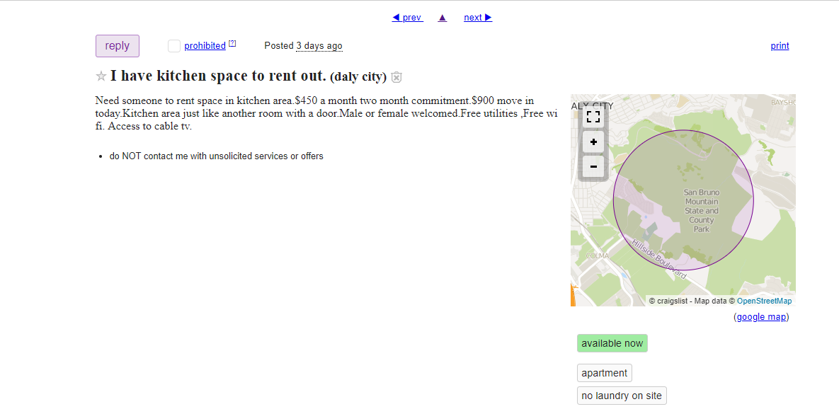 We’ve moved past the desperation stage where people are renting out their living rooms and dining rooms and apparently are on to people renting out kitchen space with no shame. This listing for a room in Daly City says it’s available for $450 a month and has a door, but it doesn’t specify anything else. Are you supposed to put your bed next to the stove? Are you renting the breakfast area? The listing is too vague for one to be sure, and no pictures of the space are available.