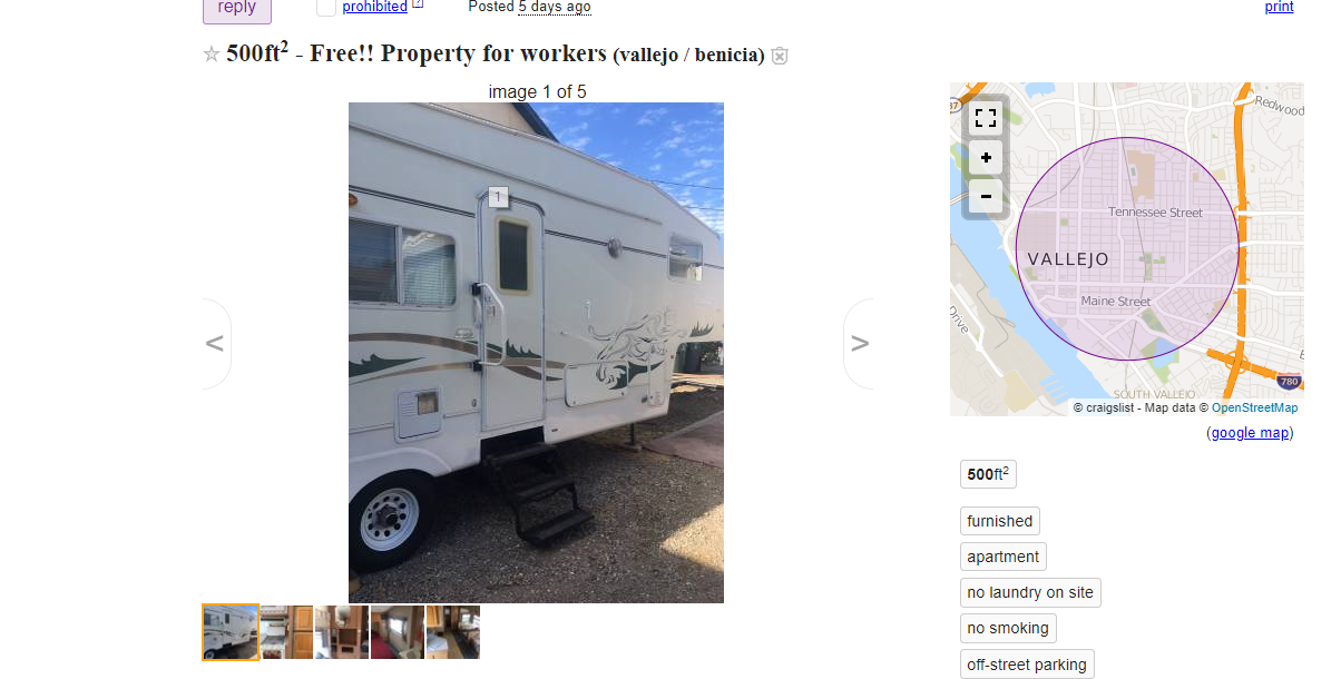 This trailer in Vallejo, which comes with basic necessities, such as a mini stove and a bathroom, is free, but as we all know, nothing in life—or nothing in the Bay Area—is really free. “Would be needed to work on the property and for property owners,” the ad reads, without specifying what kind of work the owners of the RV want you to do or for how many hours. This kind of arrangement happens frequently in the Bay Area these days, raising a lot of legal concerns.