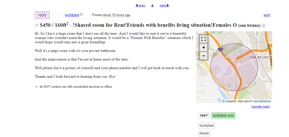 Since the Casual Encounters section of Craigslist was shut down, pervy men have found plenty of other ways to post on the site, including the rental section. At least the person behind this post, which has been flagged for removal, was honest about his request: he’s looking for a beautiful woman who’s down to have a “friends with benefits” situation in exchange for a free room with a private bath in San Bruno. We hope that the folks over at Craigslist take notice and start cracking down on this type of post asking for a “chill girl” or offering “free rent.”