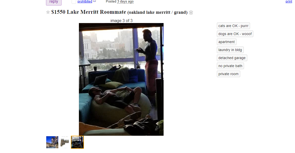 The listing for this room for rent, located close to Lake Merritt in Oakland, starts innocently enough, describing what you’ll get for $1,550: a bedroom, all utilities included, an uncovered parking space (what a dream!), great views from the 14th floor, and amenities that come with living in a big building, such as a pool, a gym, and more. Keep scrolling down and browse through the pictures, though, and you’ll get to a shot of your potential roommates, a gay couple set to get married at the next Burning Man. The photo shows one of the roommates wearing just a towel around his waist and what may or may not be a boner. Also, as the ads reads, “You will definitely see us or hear us having sex from time to time.” And there’s the catch, y’all.