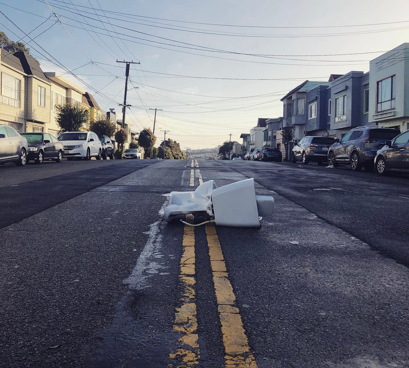 San Franciscans once stumbled upon an abandoned busted toilet lying on its side, right in the middle of the street. It was the pandemic and the day after Christmas — maybe someone had one too many honey ham servings? Gives new meaning to the term dump-and-run.