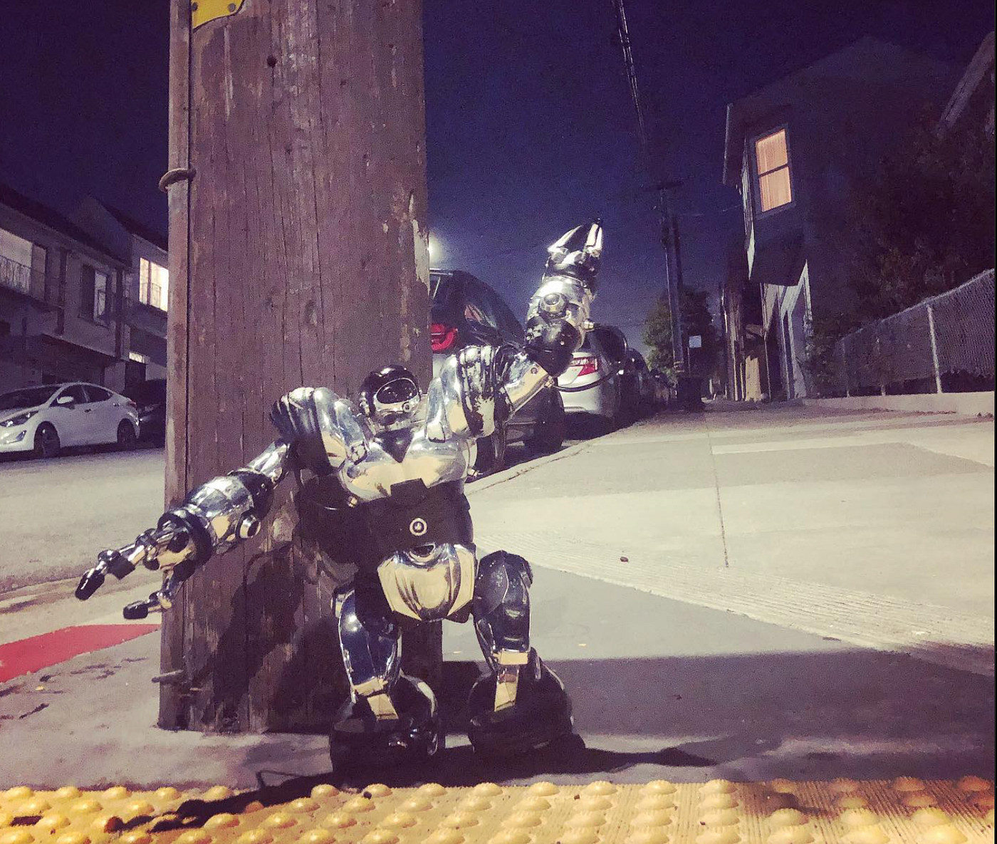 San Francisco has seen plenty of tech casualties, but usually they’re not actual robots. Yet, here sat a chrome-plated Robosapien, slumped against a wooden utility pole like it had just barely escaped a robot uprising gone wrong.