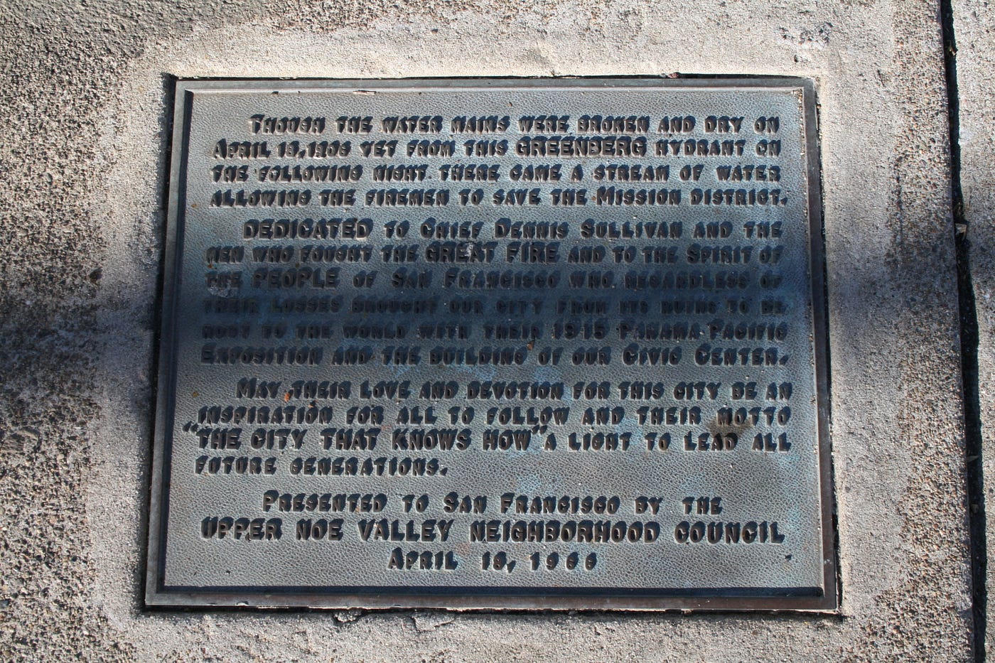 “Though the water mains were broken and dry on April 18, 1906 yet from this Greenberg hydrant on the following night there came a stream of water allowing the firemen to save the Mission District.