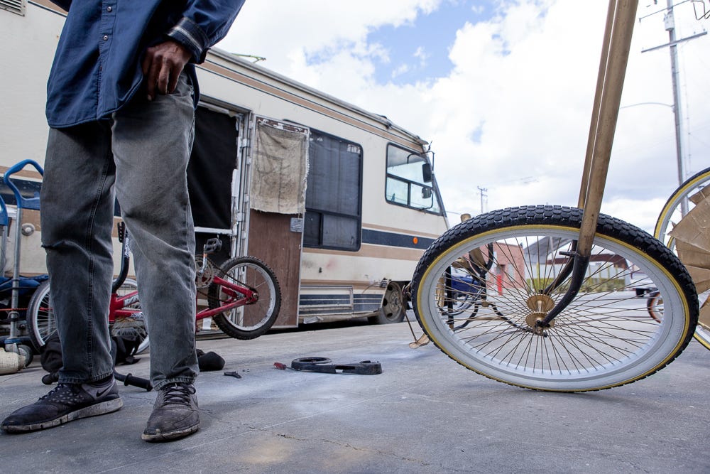 He invited me to come by and watch him work on his bikes sometime. He lives near the Home Depot in a mobile home “parked illegally,” which, I later learned, means he stays put for street sweeping because he’s cultivated relationships with city employees, who sometimes chip in a few dollars for the bikes he’s fixing up for students. That he’s able to stay in one location is part of what’s made him a neighborhood fixture — even beyond Oakland, parents from San Jose and Hayward know to bring their kids’ report cards to him.
