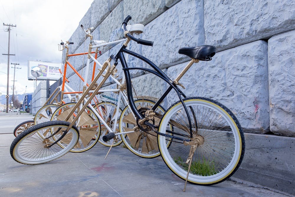 On the day I visited, his place was instantly recognizable by the bikes stacked on the roof. When Paul saw me, he greeted me with a hug and began hauling bikes out of his home and propping them on the sidewalk. One after another, there they were: double-stacks, choppers, and, finally, the little black-and-gold frame of a child’s bike with its wheels in disrepair.