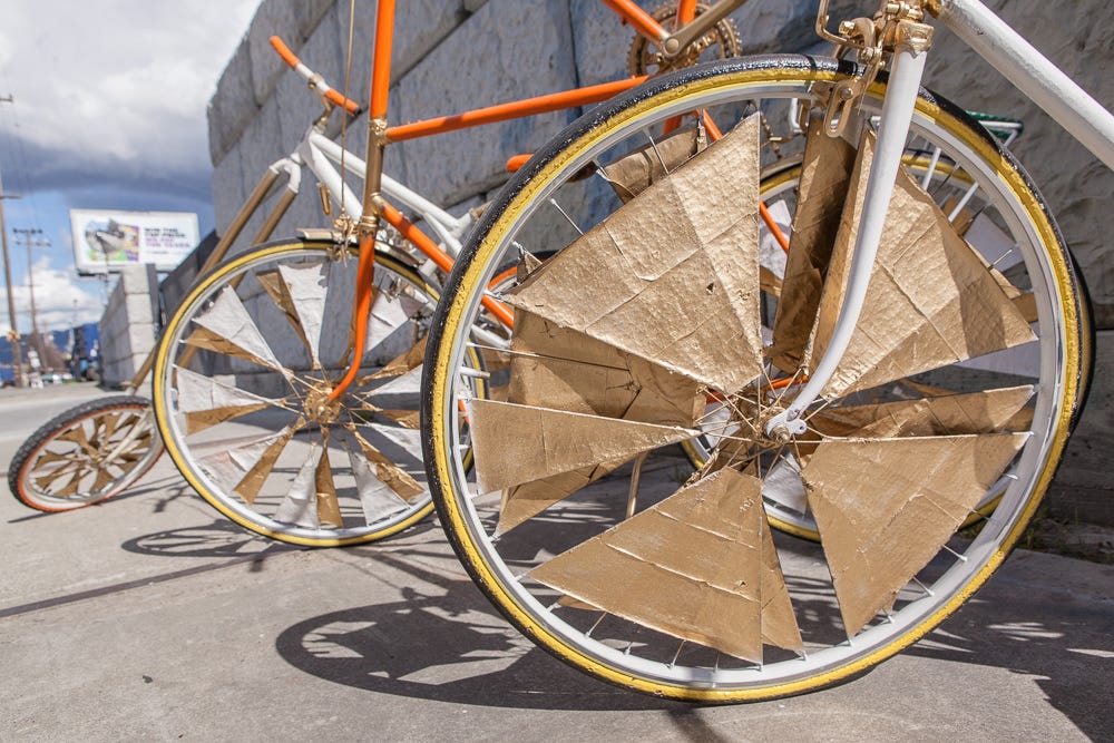 I first met Tall Paul as he was walking out of the Oakland Home Depot toting a giraffe of a bike. It was orange with gold accents — pedals, spokes, and pinwheel-shaped mags — and its body was made of interlocking triangles stacked so tall the handlebars stood at roughly my height. I was impressed and asked if I could take a closer look. “Of course,” he said, and began showing it off.