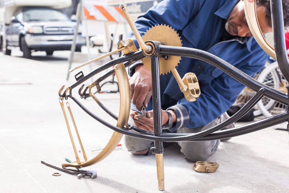 Tall Paul is tall — over six feet — with soft, dark curls he usually hides under a baseball cap. He’s cordial, but when he starts talking bikes, a kind of electric and childlike wonder steals over him. You can’t help but feel enthusiastic too. When I asked how he mounts such an ungainly ride, he demonstrated by giving it a shove as he jogged a few steps beside it, then he clambered up the triangles of the frame like they were a ladder. “Where did you get it?” I asked him. “I made it,” he said.