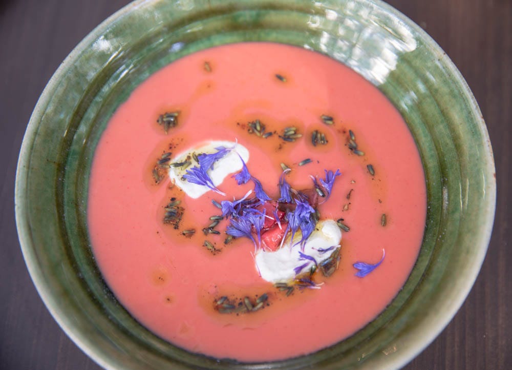 We moved into arguably my favorite dish of the whole meal, showcasing a fruit California grows for the entire U.S.: strawberries. These are Albion strawberries in gazpacho form, the cool, pink soup teeming with pickled green strawberries, a whisper of jalapeno, lavender olive oil, almond cream and wildly aromatic lavender buds. It tastes like California summer in all its radiance, cooling the dry heat with sweet, tart, aromatic goodness.