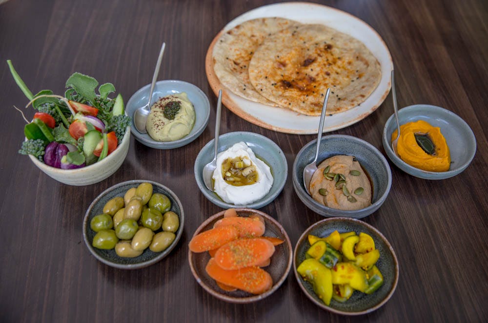 Then, the dips: split pea hummus accented with spicy zhoug, pumpkin seed dip in chile oil, cultured cashew “cream” dotted with charred spring onions and a dip special of carrot tahini in black sesame oil. One could make a meal of the dips, lavash and veggies alone and leave happy. It’s an ideal meal at the bar or counter top with a glass of wine or cocktails.