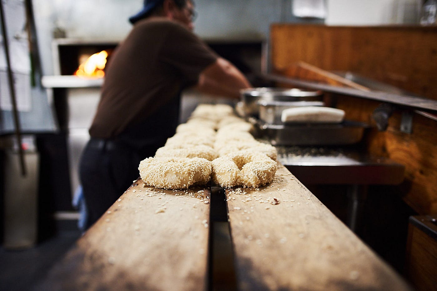 It could have been due to my early-morning daze, but I watched, mesmerized, as bagels moved from their boiling station to the wooden planks where Beauty’s Bagel Shop co-owner Blake Joffe seeded them near the fire. Despite all the movement, it was quiet.