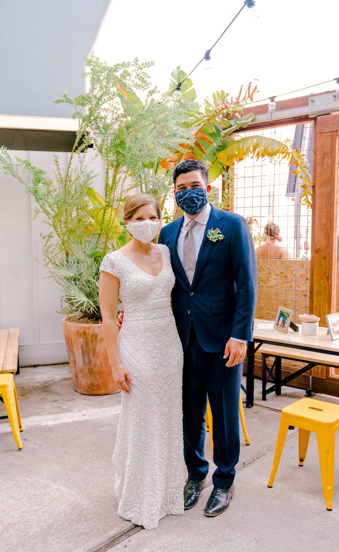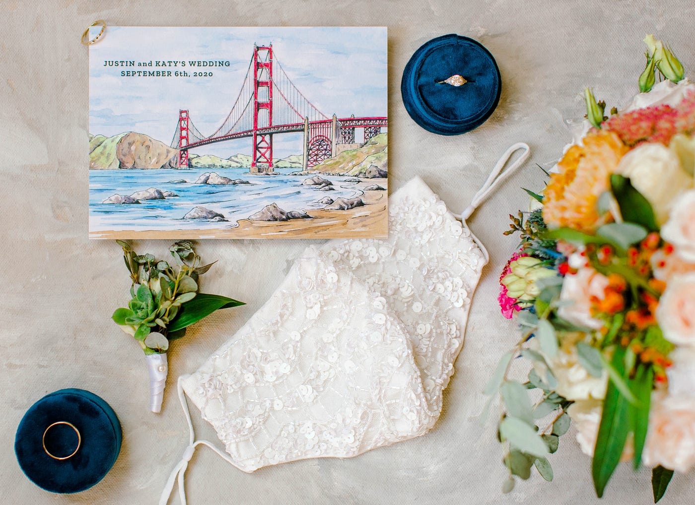When I was getting my dress tailored at Eclipse Alterations in Oakland, my (now) mother-in-law, Sue, suggested saving the remnants from the hemming. Sue was able to sew the most amazing mask from the remnants! Although, since the dress is fully beaded, I think she may still be finding loose beads around her condo. She’s a quilter and has been making masks for us and our extended family throughout quarantine from her leftover quilting fabric. Sue also made matching masks for my sisters’ bridesmaid dresses from their dress remnants. My mask will be a fun keepsake to have of this time.