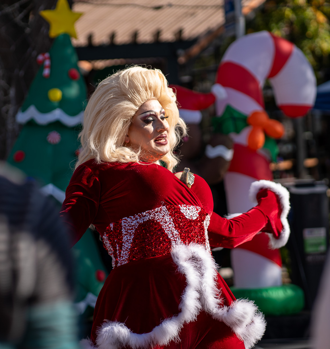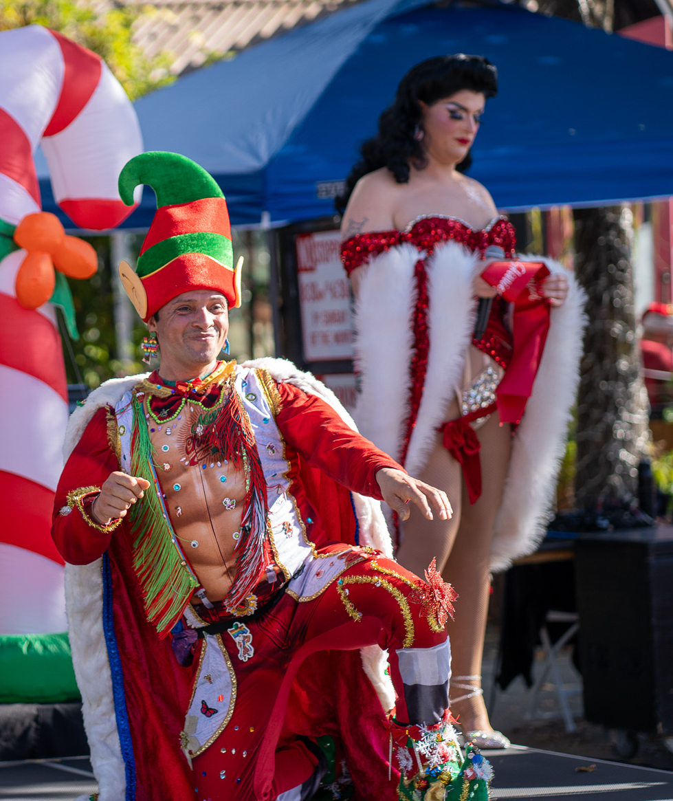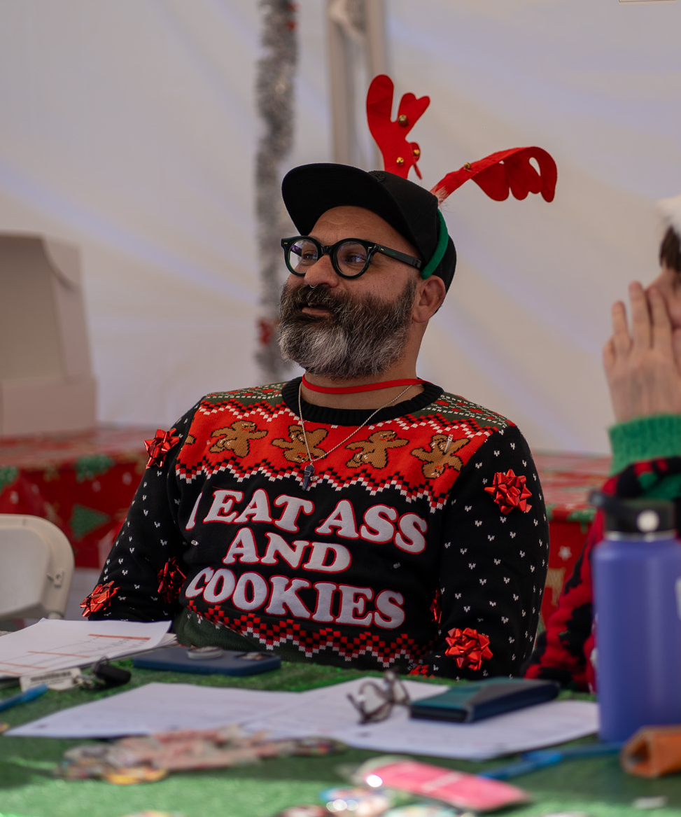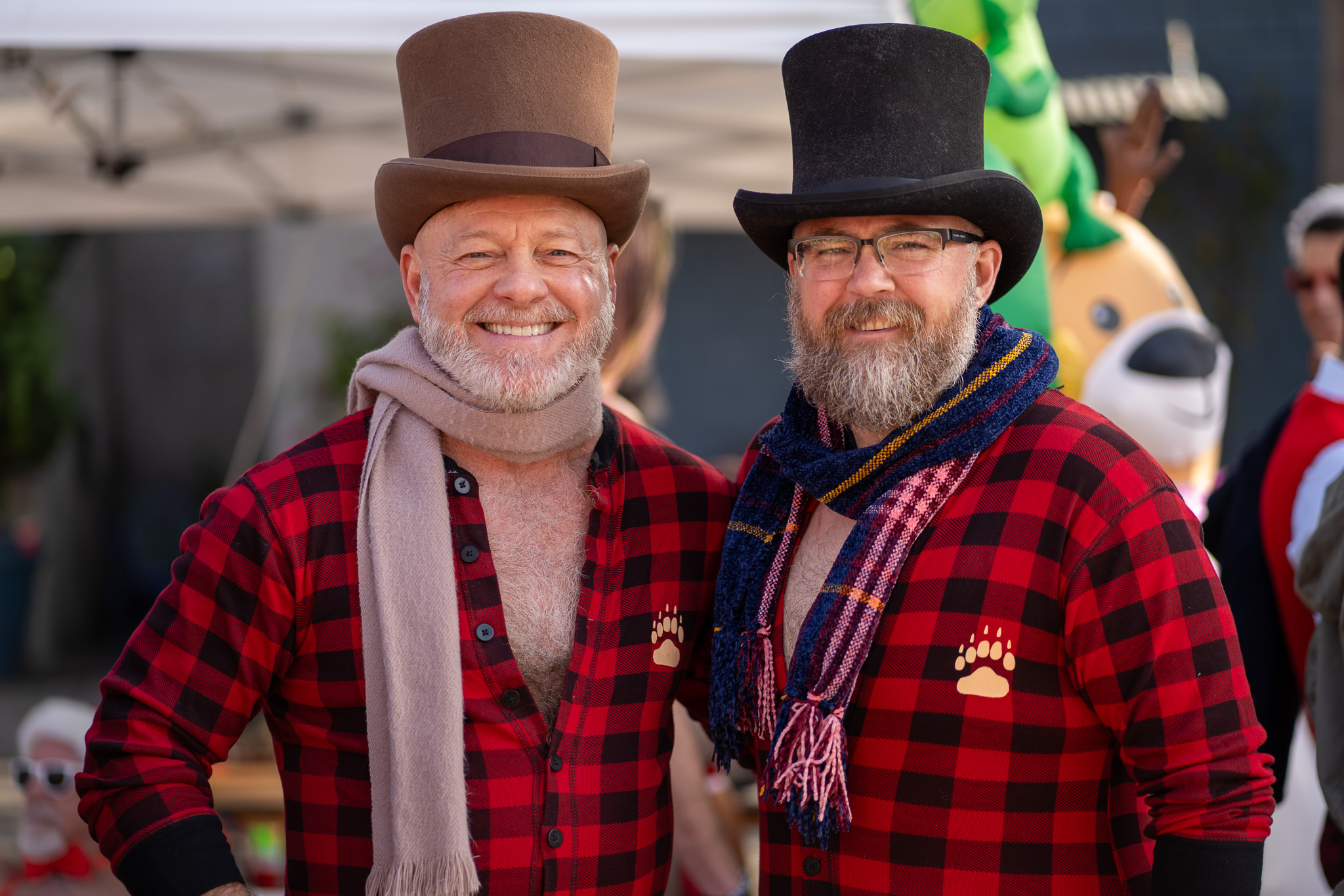 By far the most classy-looking specimens at the event were Blade Bannon and his accessory, Aaron. Dressed in matching plaid onesies, they were giving “Hugh Hefner goes gay for Christmas.” (Hallmark Studios 2025?) Bannon is no stranger here — he volunteers in the community, assisting with the Castro Community Challenge Grants Program among other things — but this was his first year running.