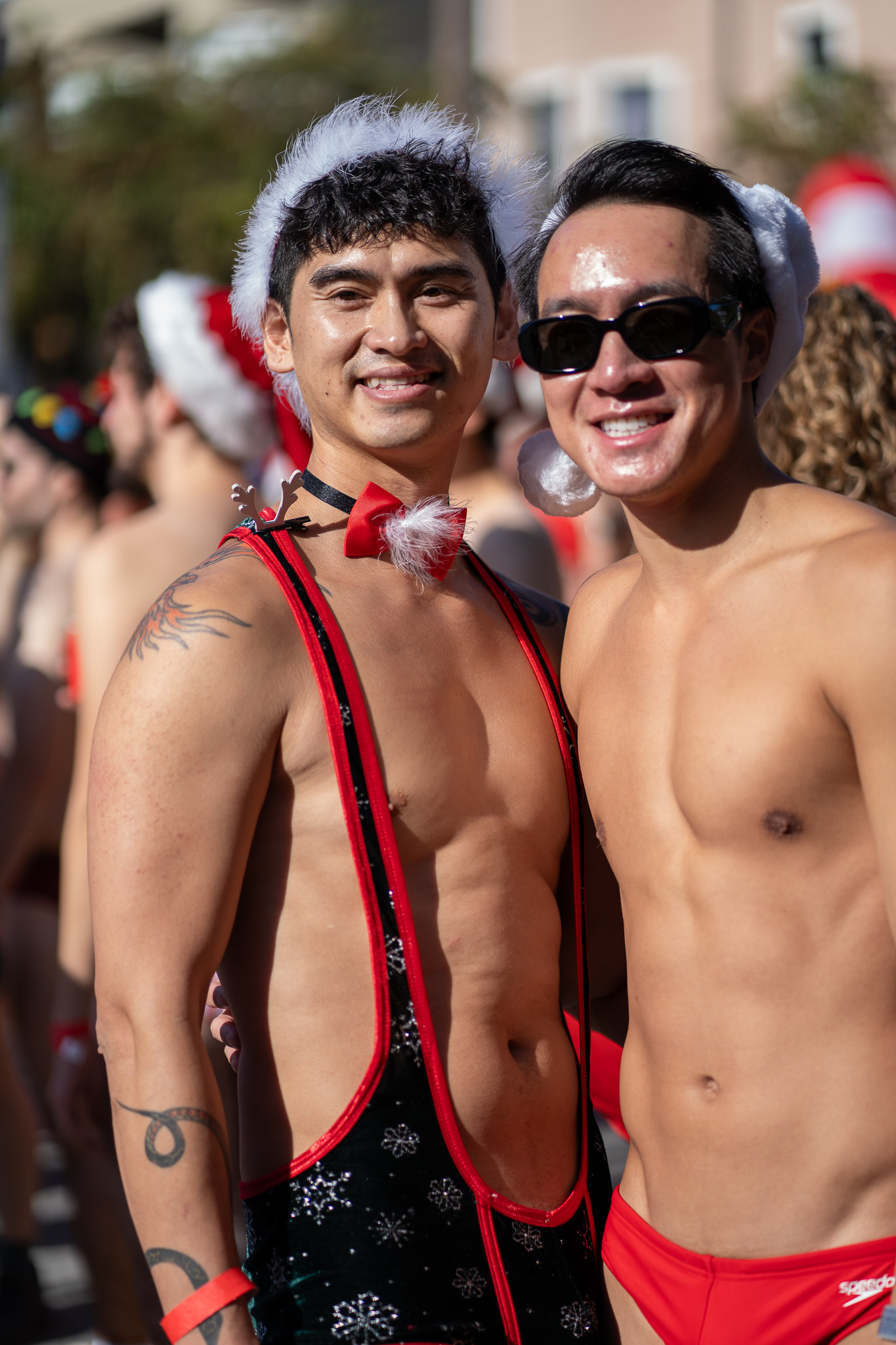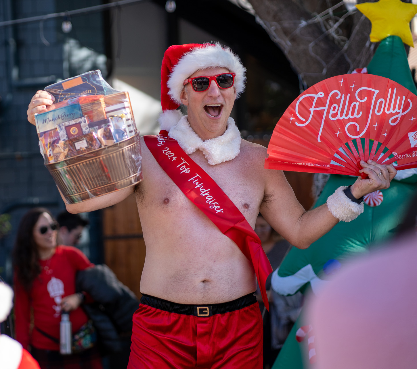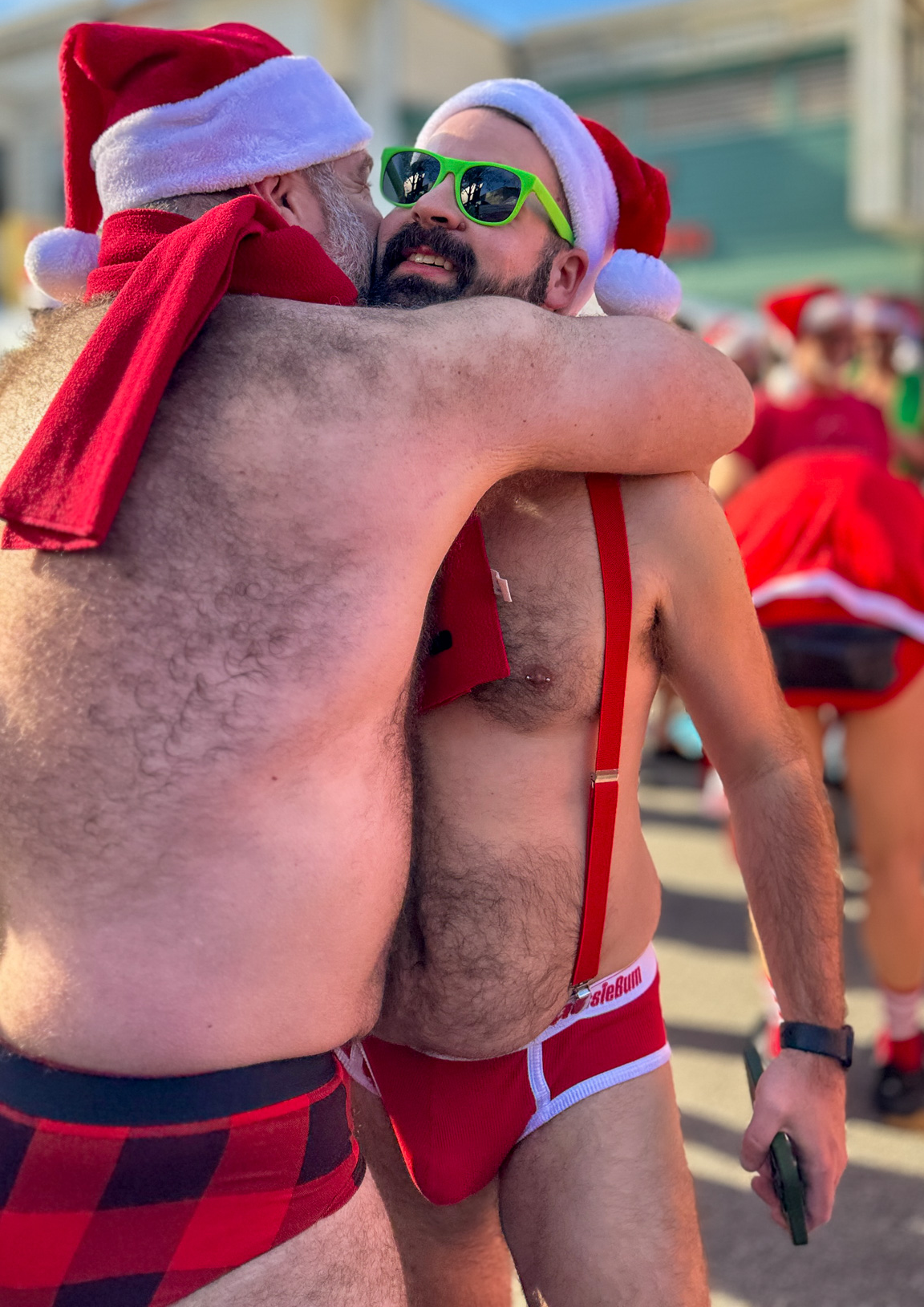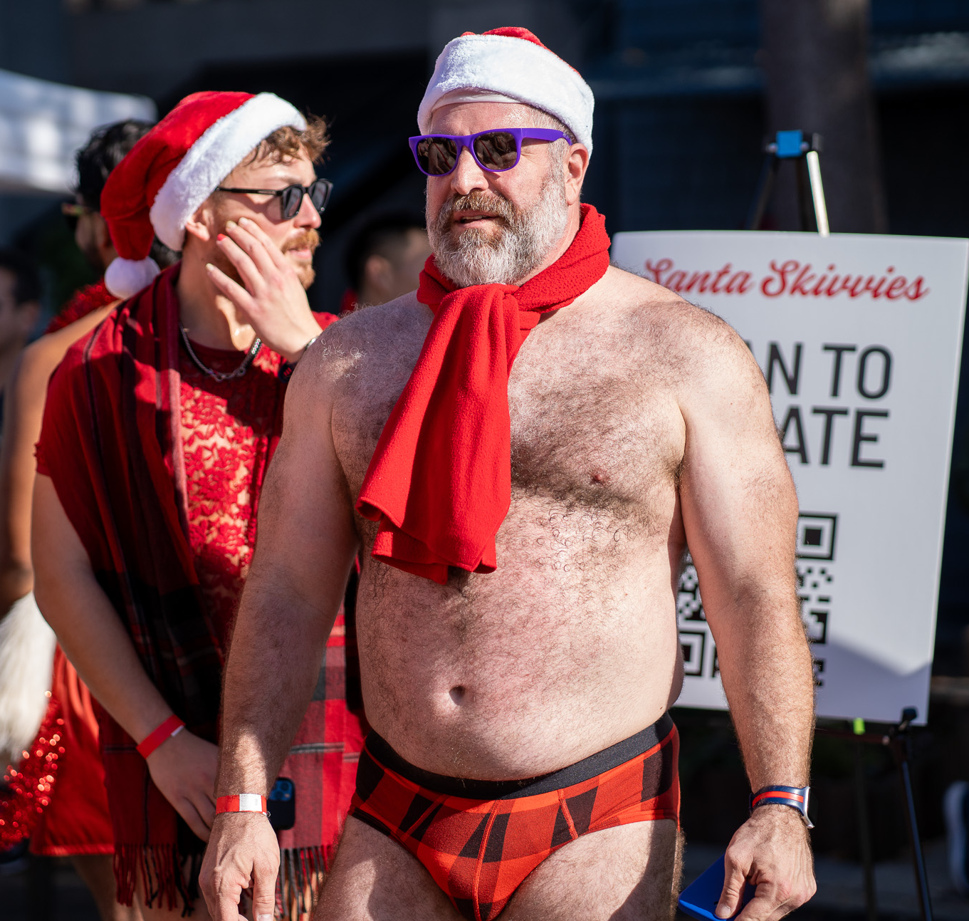 Santa Skivvies means something different for everyone. Juan Ramon has been volunteering in Castro for quite awhile, for instance, marking the 7th year he joined on Sunday. He definitively won the most decked out award, donning a full-coverage outfit with false abs, a Santa cape, and festive homemade green slippers — I assume left over from last year’s Grinch outfit.