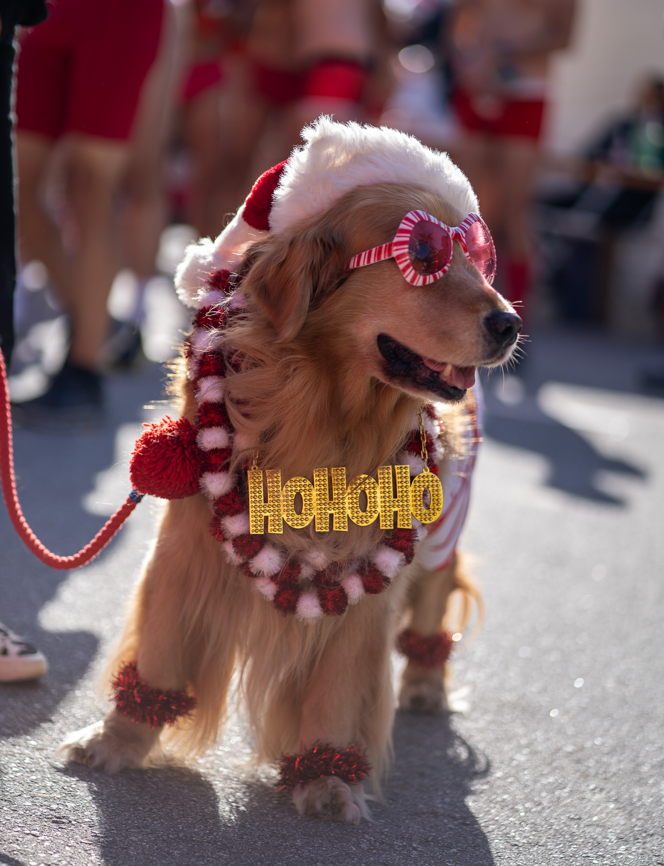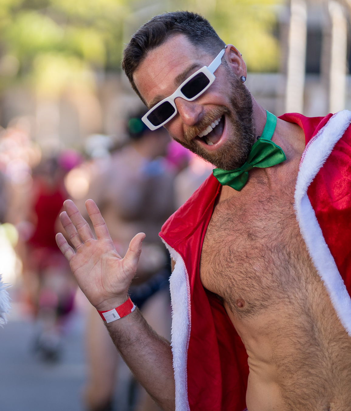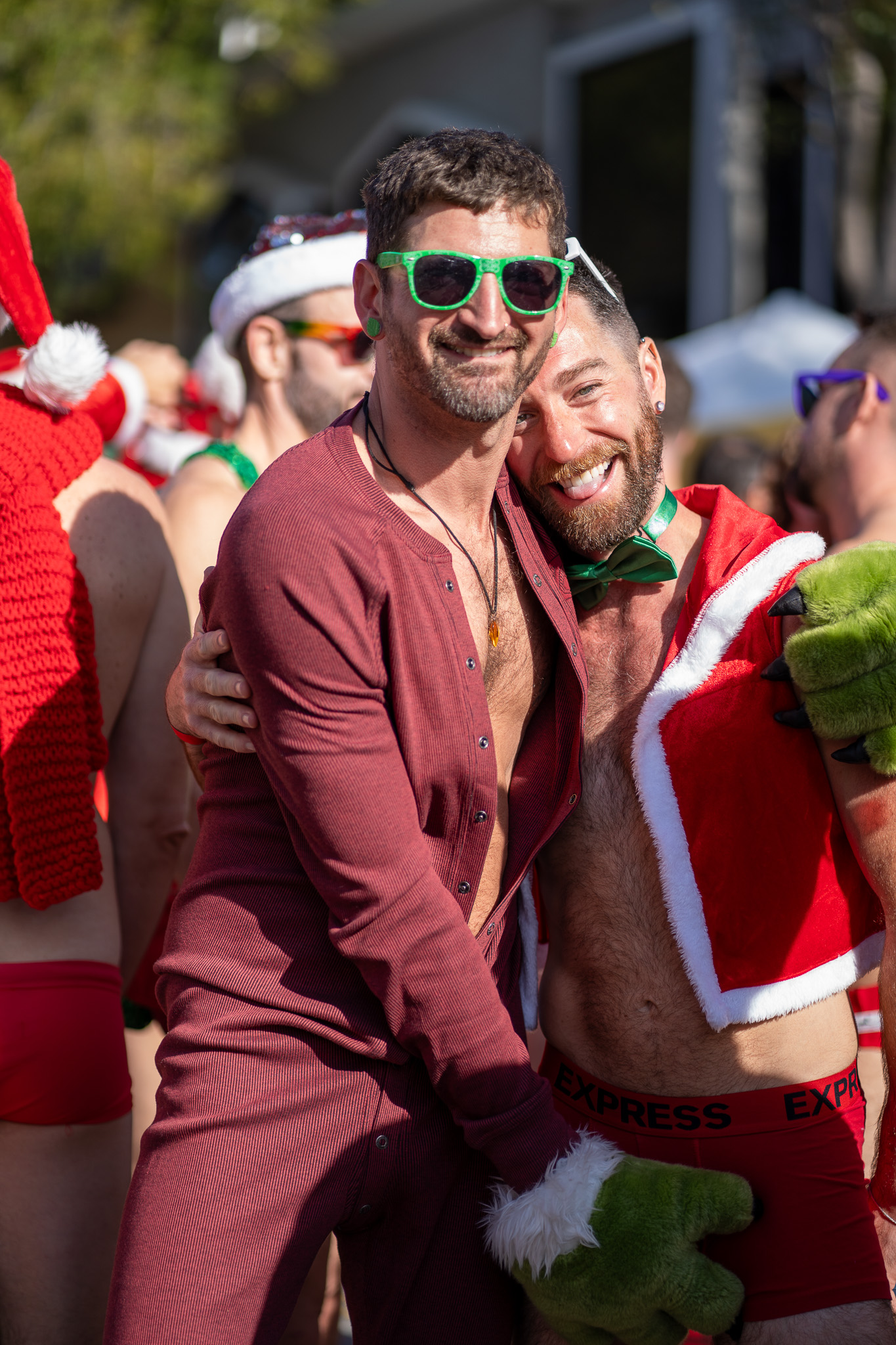 Santa Skivvies is way more about taking off your clothes than celebrity sightings, but I did spot Scott Wiener and Brixton, the costumed Golden Retriever who makes more appearances than a drag queen at Pride. I found Wiener’s blue monochrome outfit with the Patagonia vest honestly a bit lacking. But per usual, Brixton was perfectly on-point in a gold “HoHoHo” necklace.