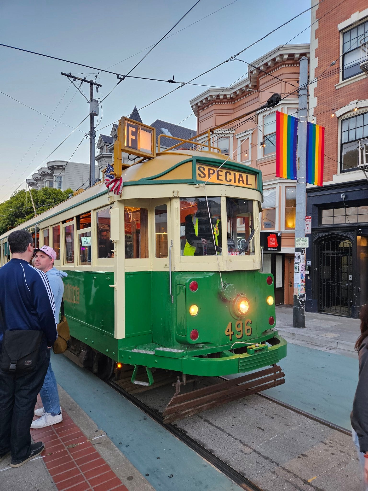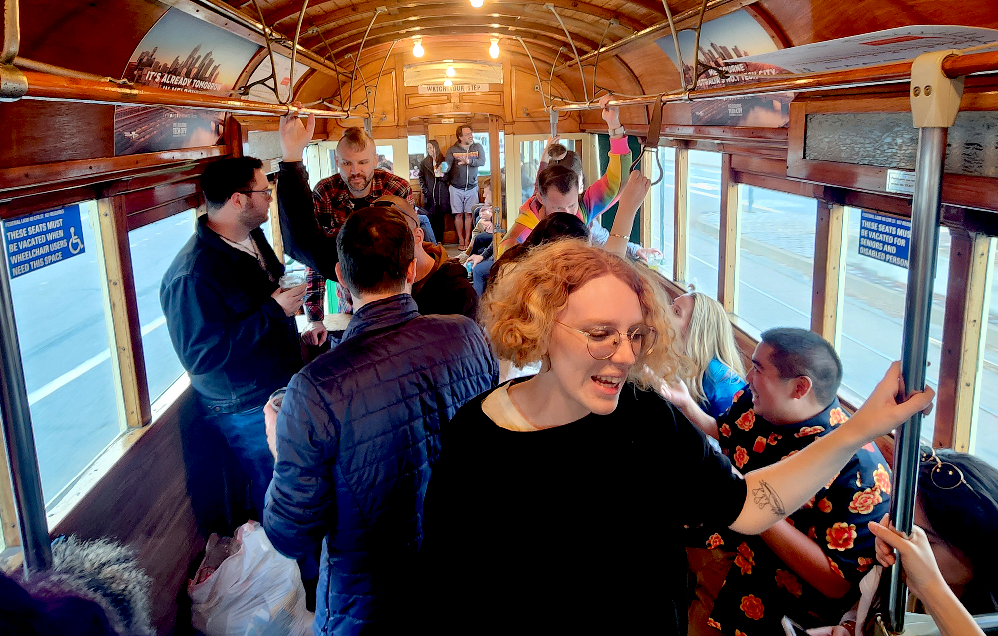 That was my original thought, at least. Both cable and streetcars are available for charter with some caveats: only historic and vintage streetcars allow booze, food, and music. Many have limited seating, and you can’t bar hop — the train goes along a predetermined route with very few stops. SFMTA actually told me no stops at all when we emailed, but the operators kindly made a bathroom break; they also let a few riders off early and picked one up belatedly.
