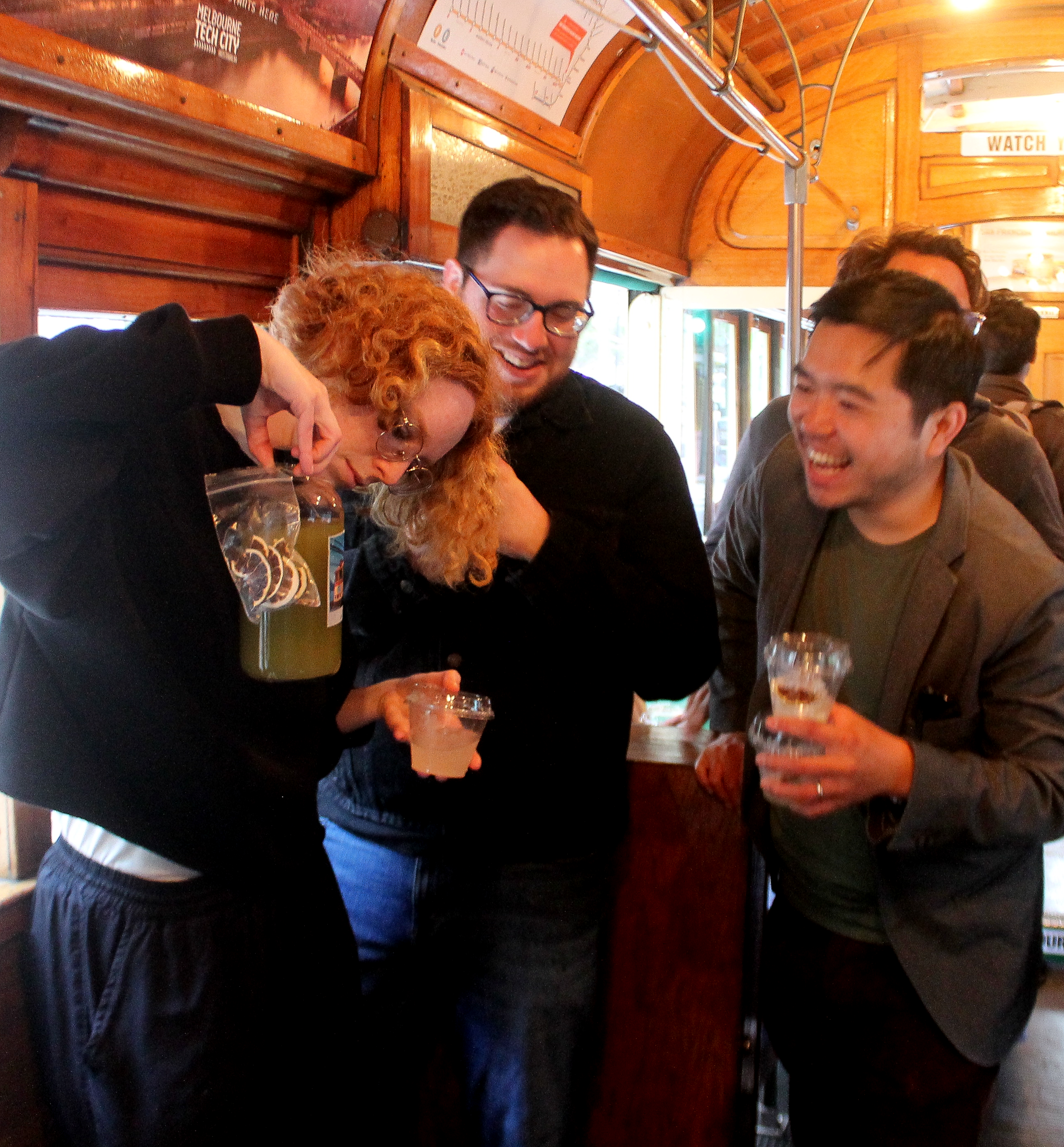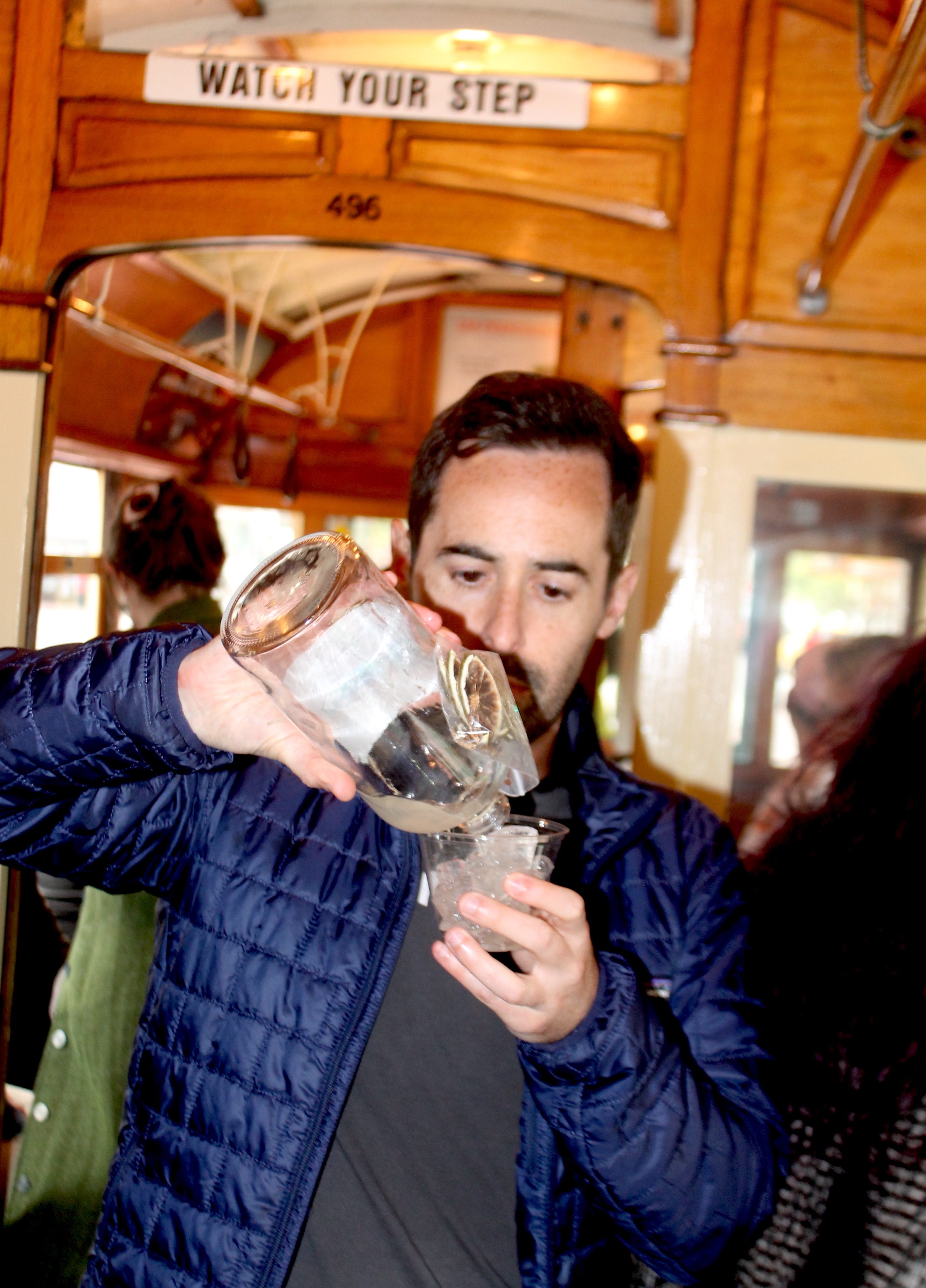 I picked the F Line for its 52-seat capacity. The charter cost $500 for two hours, and remaining ticket sale dollars went toward every ounce of booze I could pack. Rye on the Road supplied us amply with a paloma cocktail and gin gimlets, and everyone drank those so fast, with my hands grabbing ice and filling airplane cups with sippy lids for a solid 40 minutes as the train got going. My boss hustled around too — oops — filling cocktails from Rye on the Road, and making sure everyone signed the “don’t sue us” waiver.
