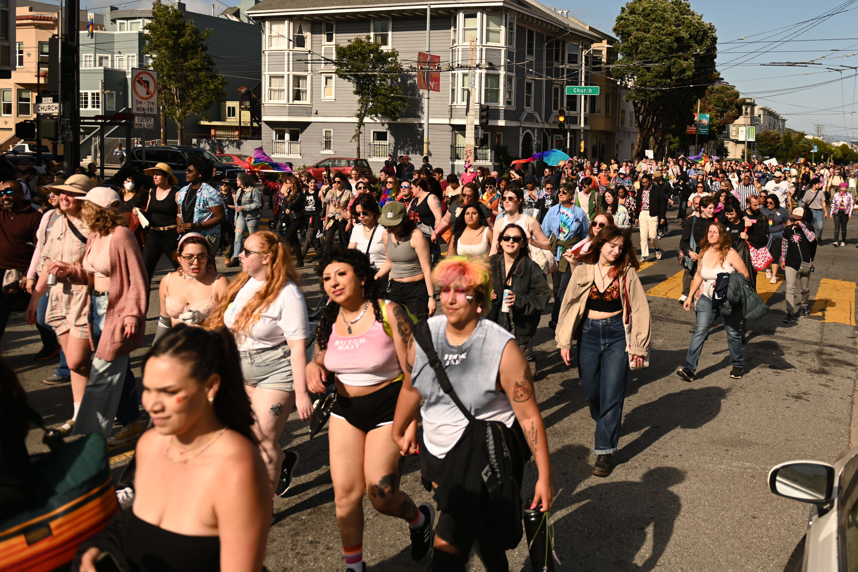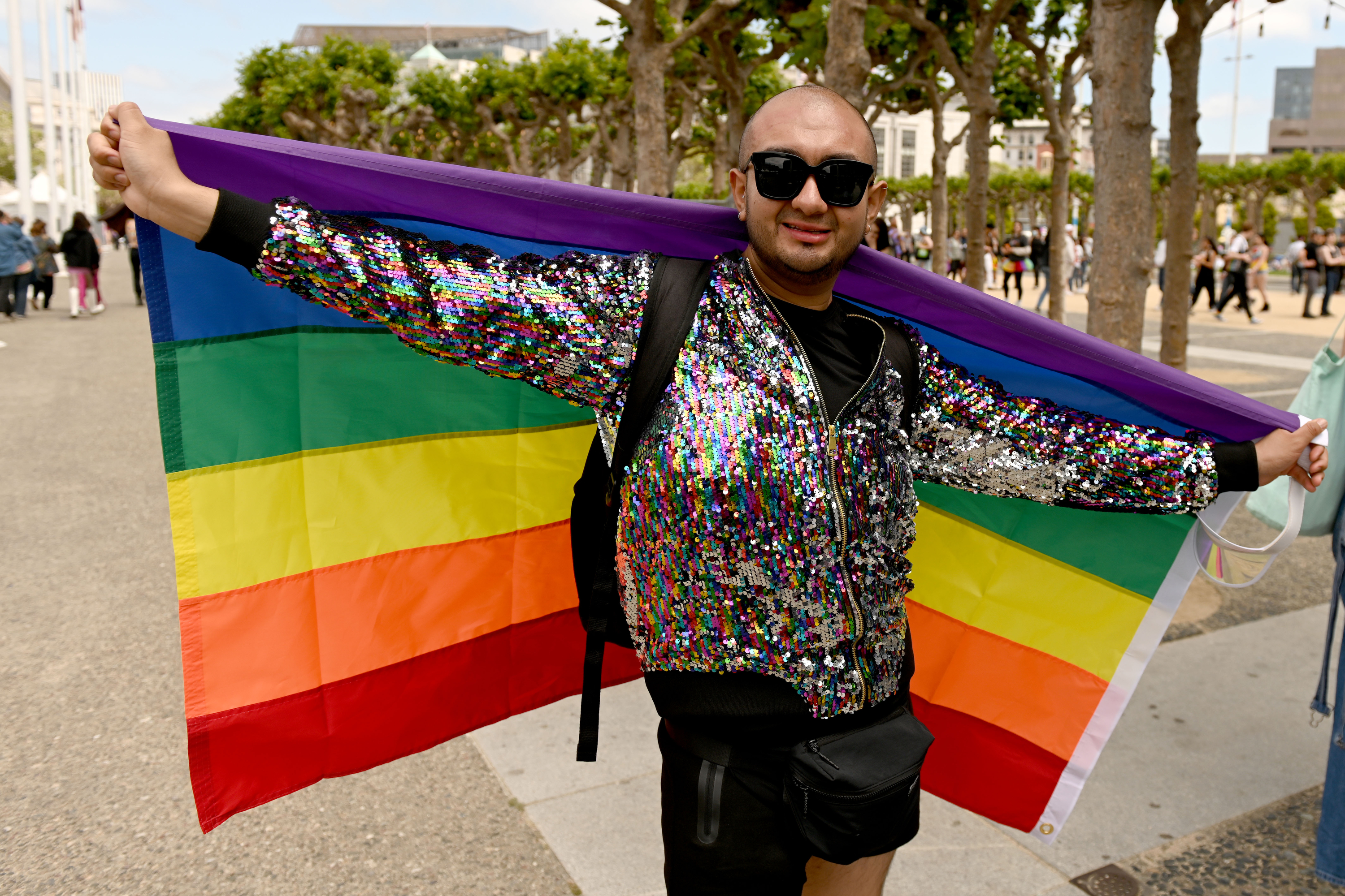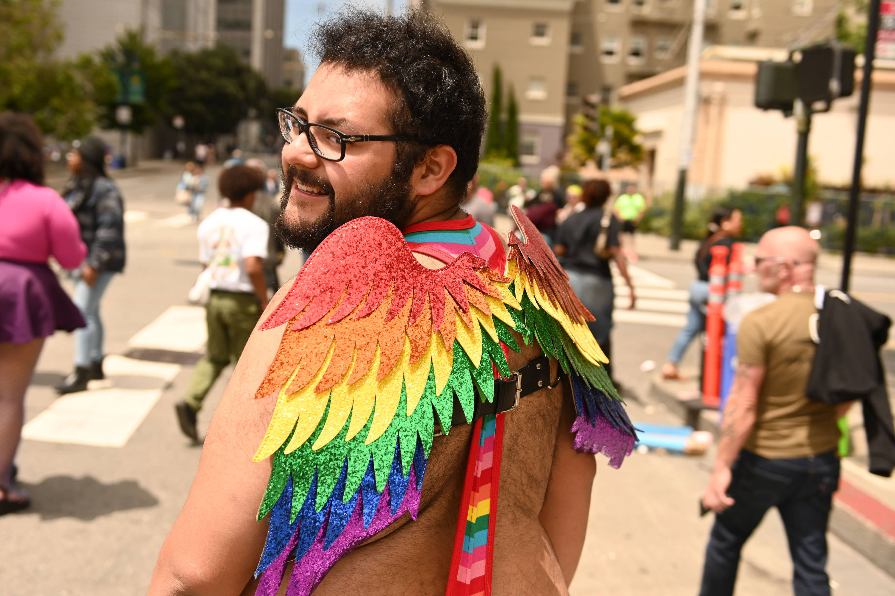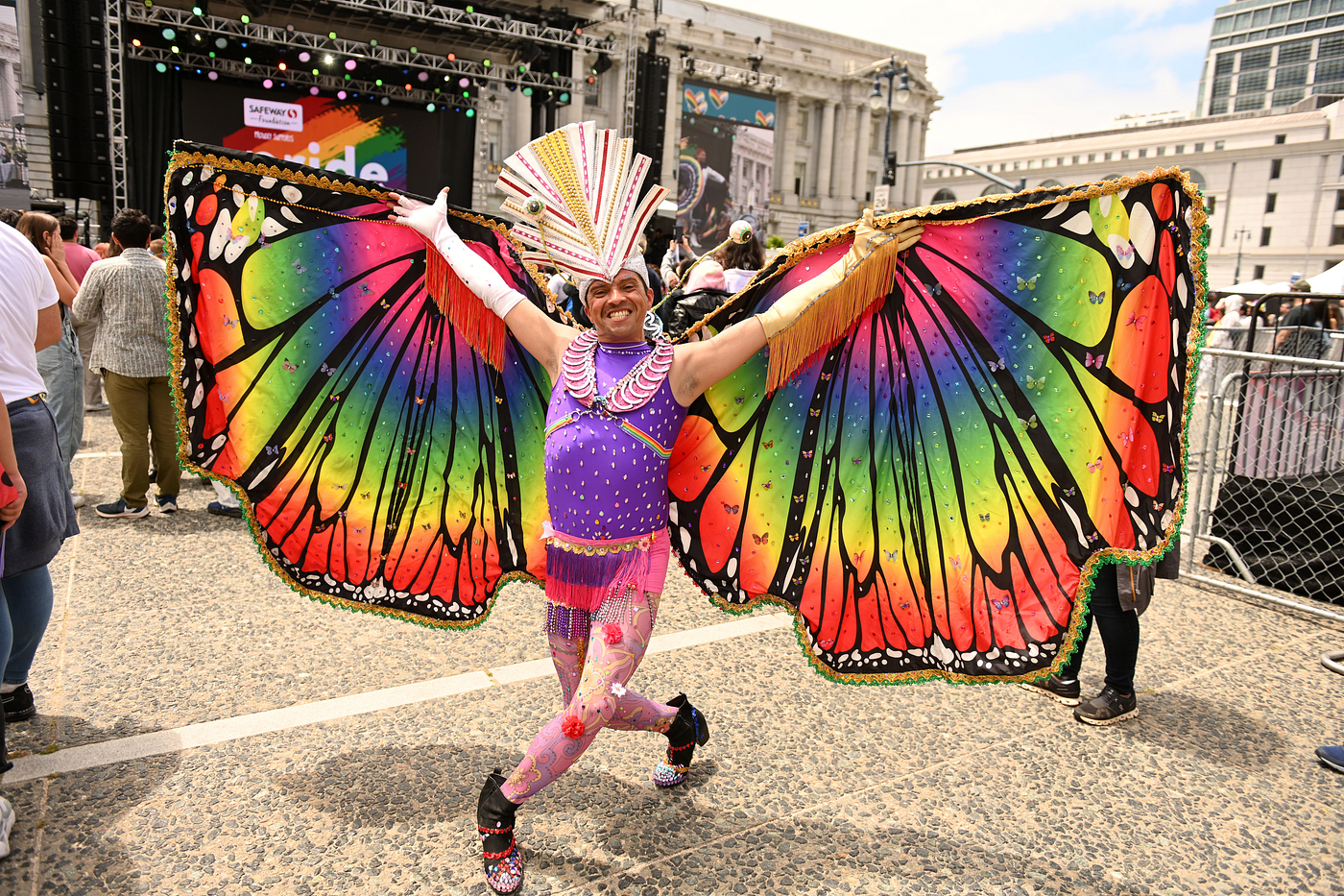 As I walked through Civic Center on Saturday, a cacophony of rainbows filled the plaza, with people dressed to the nines — and some not at all. Sparkling jackets and Pride flags were typical accessories, and quite a few attendees carried massive rainbow-flushed butterfly wings, spreading their arms for photographers. Myself included.