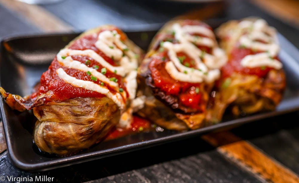 I was delighted to see a version of gołąbki here, Polish-style stuffed cabbage rolls, listed as “Impossible stuffed cabbage,” filled with Impossible vegan “meat” and porcini mushrooms, drizzled in tomato sauce and vegan sour cream. This gratifying vegan dish pleased our entire table of meat eaters, though I could envision two Gambit versions (meat and vegan), as cabbage rolls are such a ubiquitous part of the region’s foods.