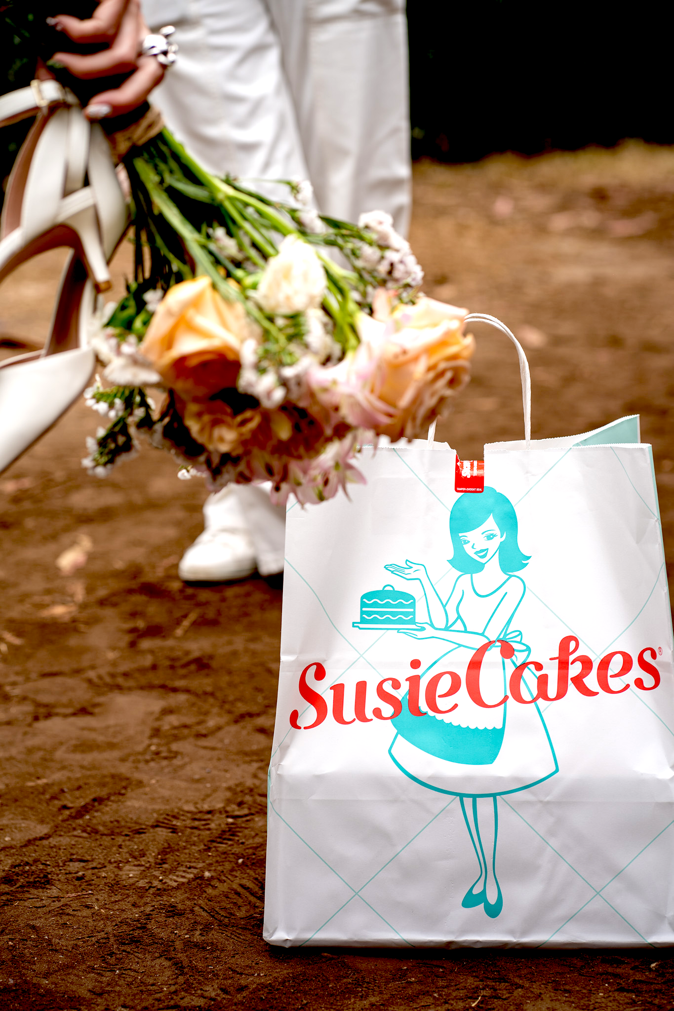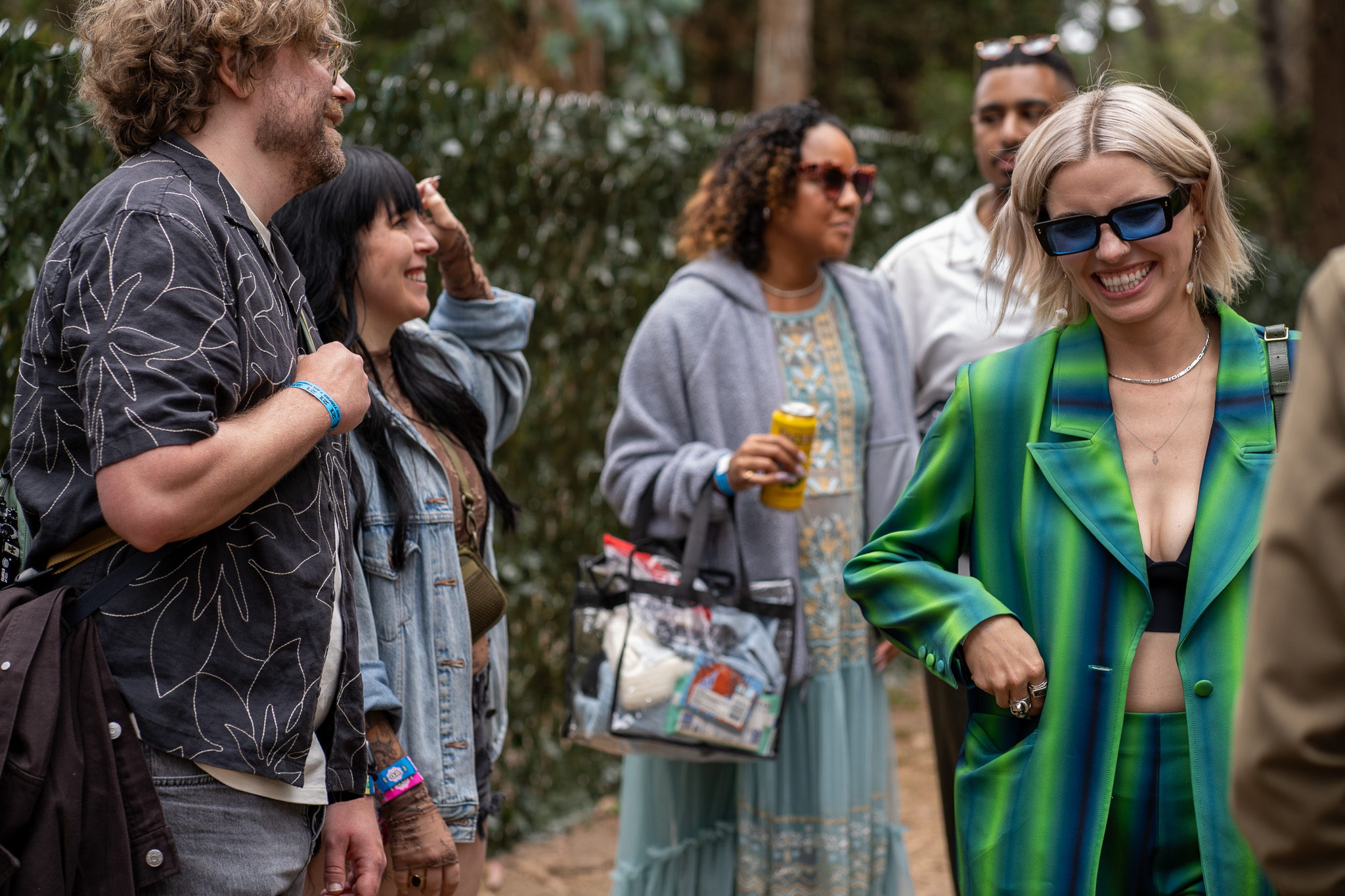 Amber appeared relaxed as she greeted friends, who arrived in tasteful festival attire. The groom showed up with a Susie Cakes bag in hand. “You’re allowed to bring food in!” he said with a grin.