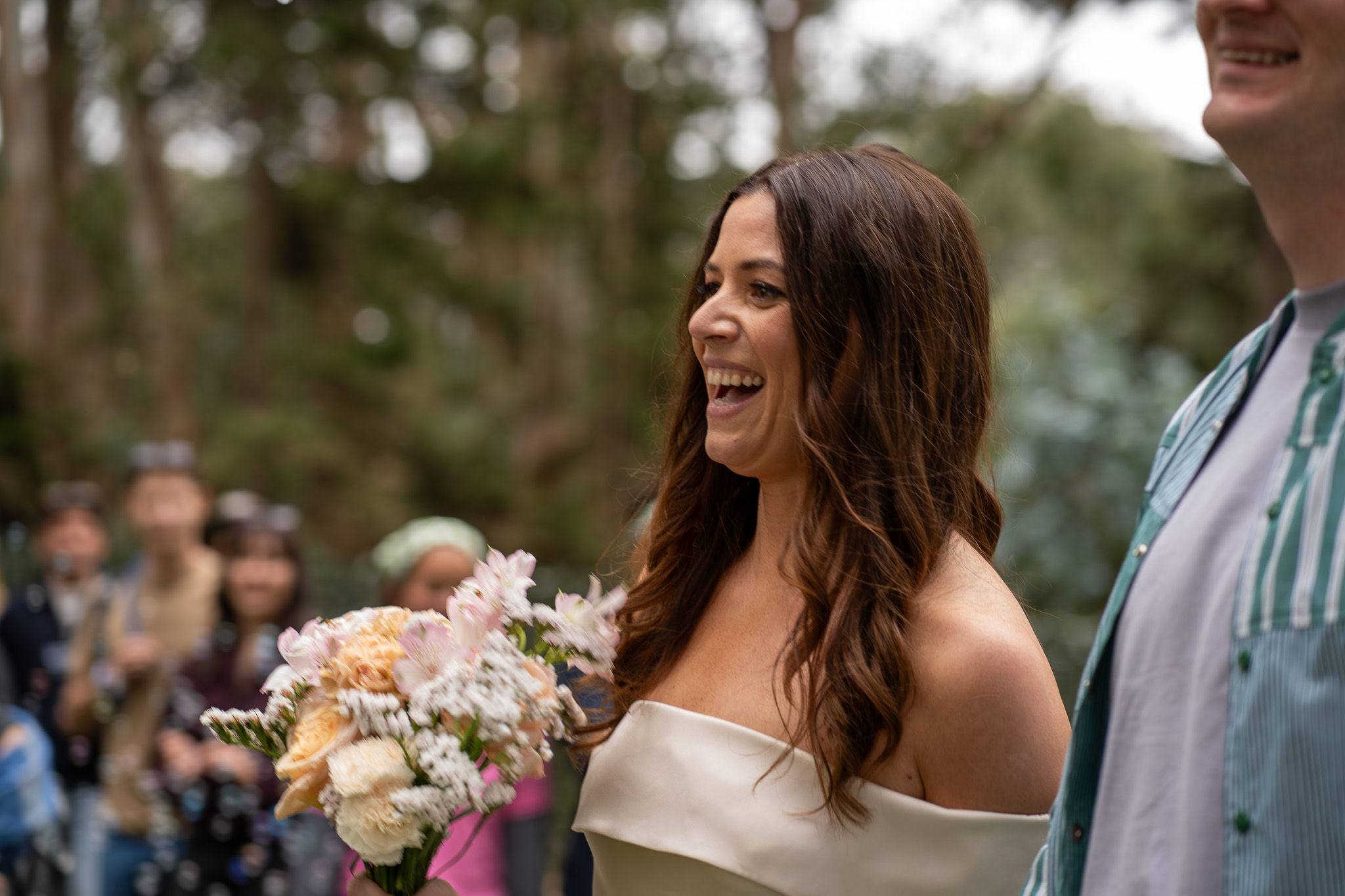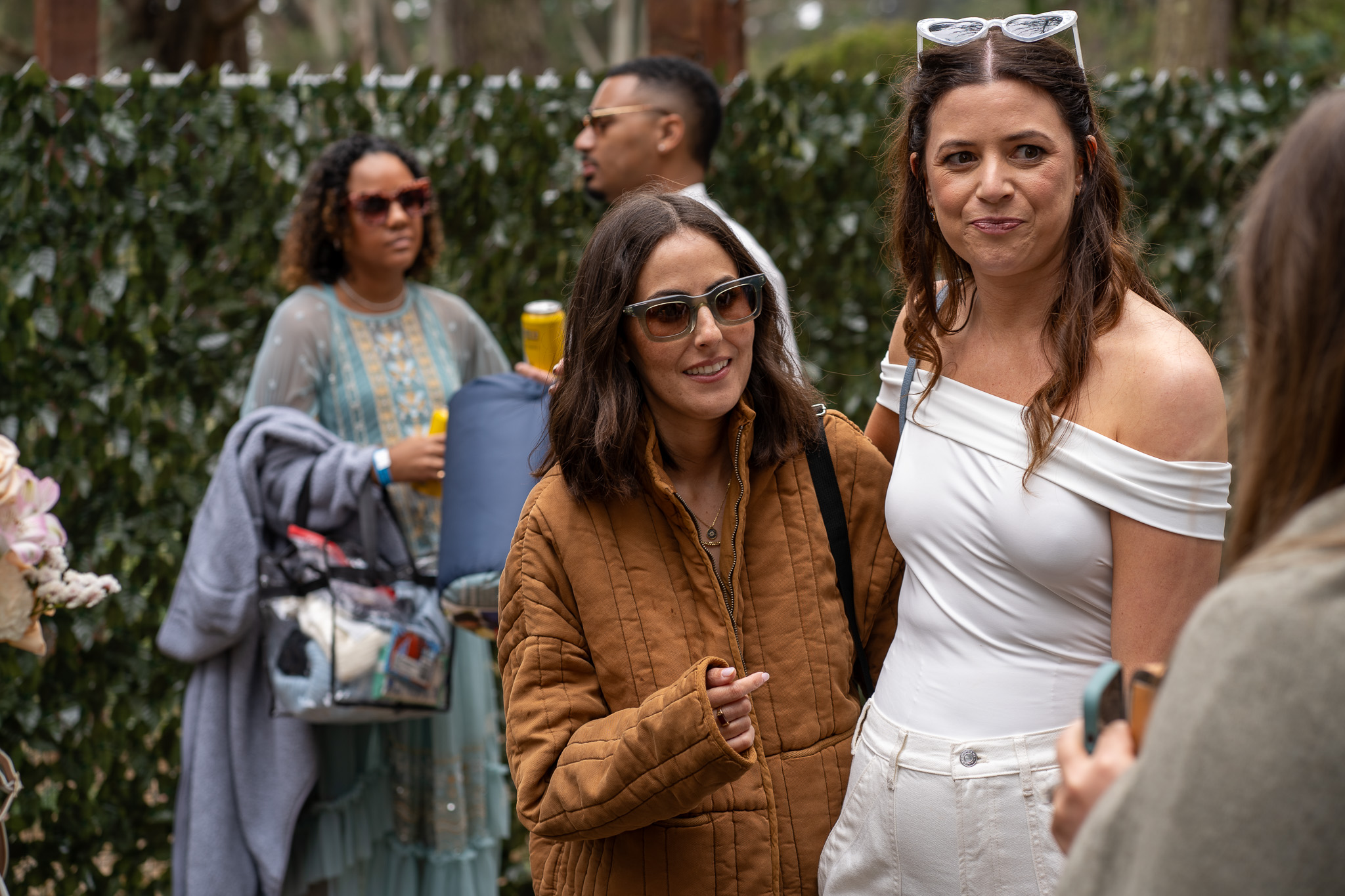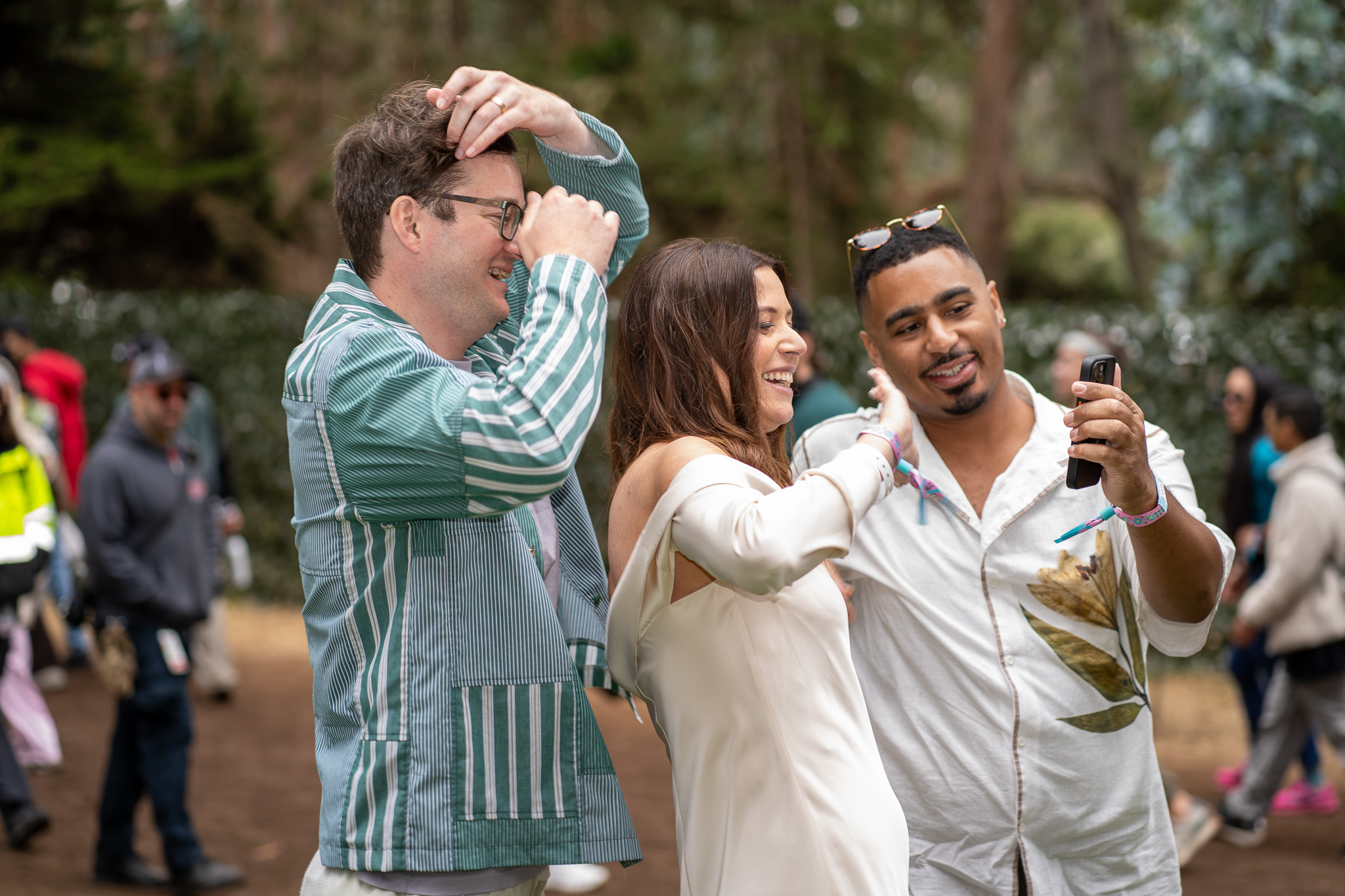 “Yeah, you are — I have a muffin in my pocket. It’s from the breakfast spread at the hotel,” said bridesmaid Janine Kirtland from Colorado, dressed immaculately in a green pantsuit and sunglasses. She shared stories of the low-key preparations, including a “Jamber” playlist she made for guests to familiarize themselves with the artists performing at Outside Lands.
