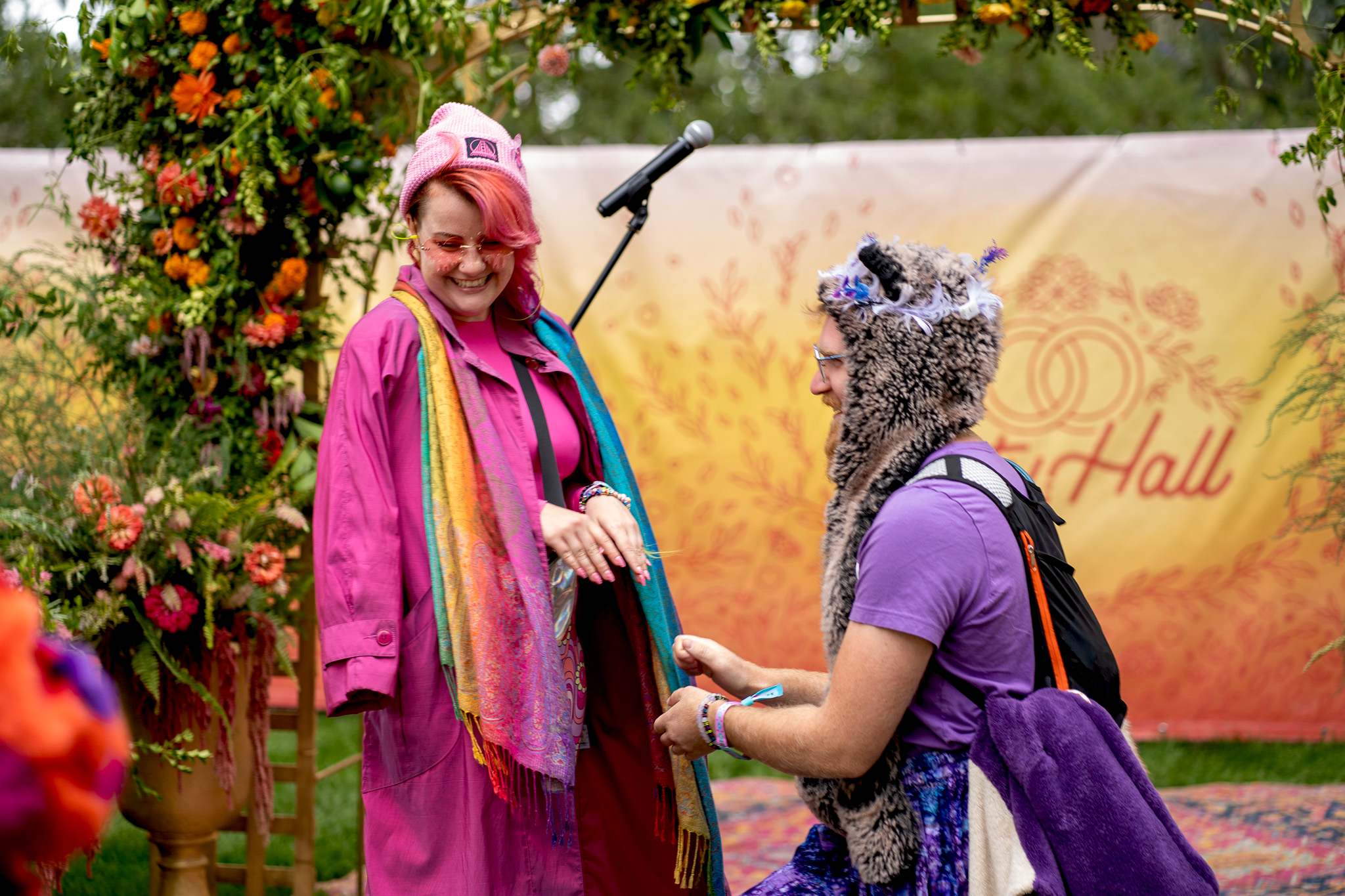 Looking like a seasoned festival-goer in a blue tie-dye suit, the father of the bride was ecstatic for the occasion. “She and Josh have been coming here every year since they got together, so I think it’s so cool that they’re getting married here. It’s one of the happiest days of my life. She’s my pride and joy, and this is perfect for them,” he said with a proud smile.