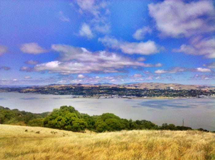 We make it to the Carquinez Overlook Loop Trail, with the eucalyptus groves of Bull Valley to the left and the Carquinez Strait waterfront to the right.