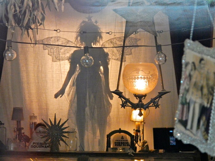 Another day, another whimsical yet mislabeled place of business: Theatre of Dreams is actually the home of the shadow boxes and vintage-paper crafts of local artist Wendy Addison.