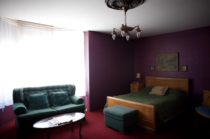 Each room of the Burlington, named after a different “lady of the night,” has a unique look to it: dated wallpaper, antique light fixtures, oil paintings, and throw blankets only a grandmother could love.