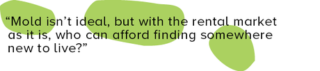 Which brings us back to mold. Sure, living with mold isn’t ideal, and no one really wants to do it, but on the other hand, with the rental market as it is, who can afford finding somewhere new to live? We fear mold because, yes, it can cause startling health effects and make for a shitty living situation, but some of us fear mold more because its presence indicates a reason why we might be removed from our current living situations, regardless of how substandard they might be.